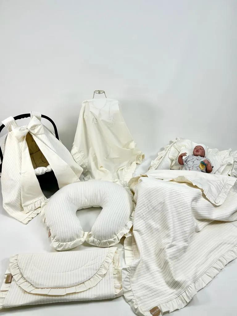 Krem örgü pike ile krem rengi poplin kumaşlardan üretilen 8 ’li Set içeriği;