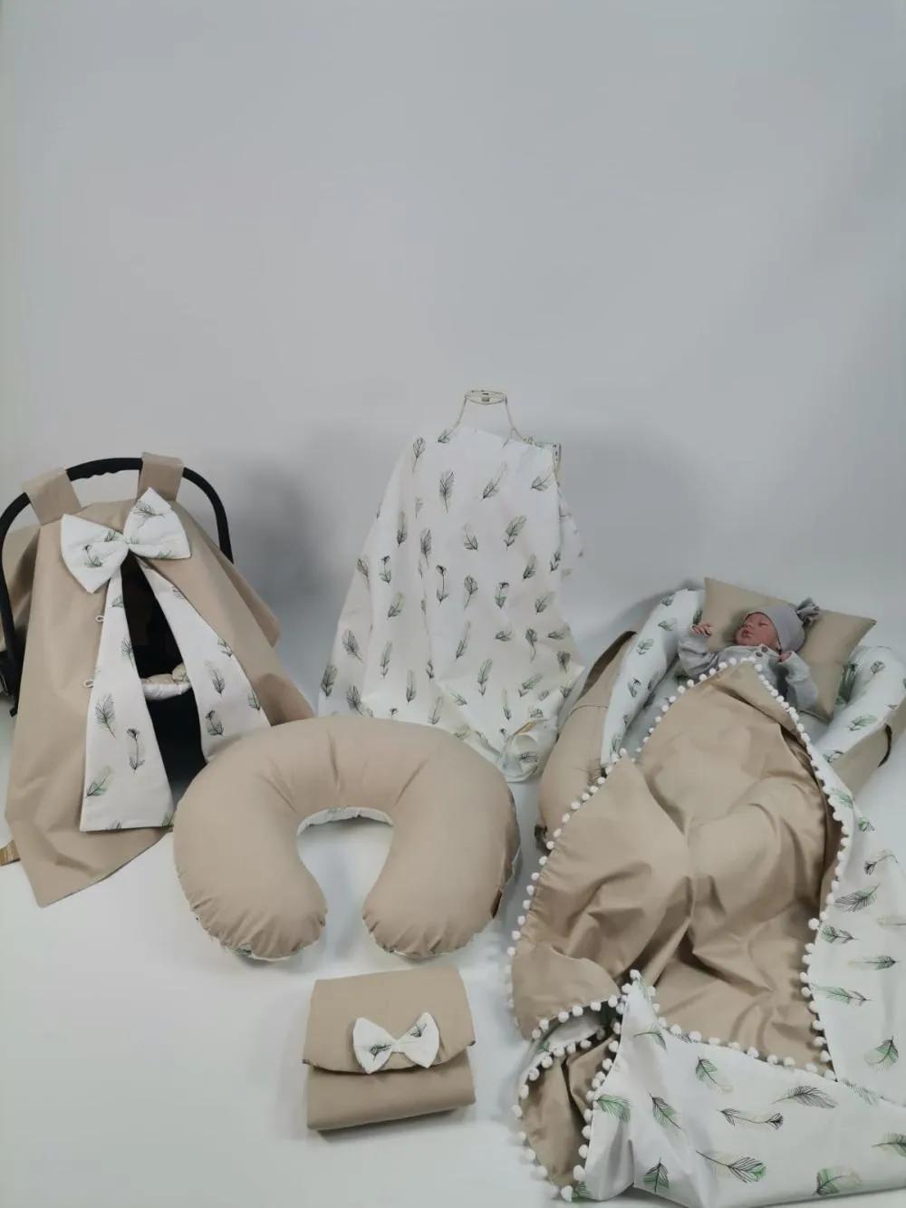 Bej rengi ile yeşil tüy desenli poplin kumaşlardan üretilen 8’li Set içeriği;
