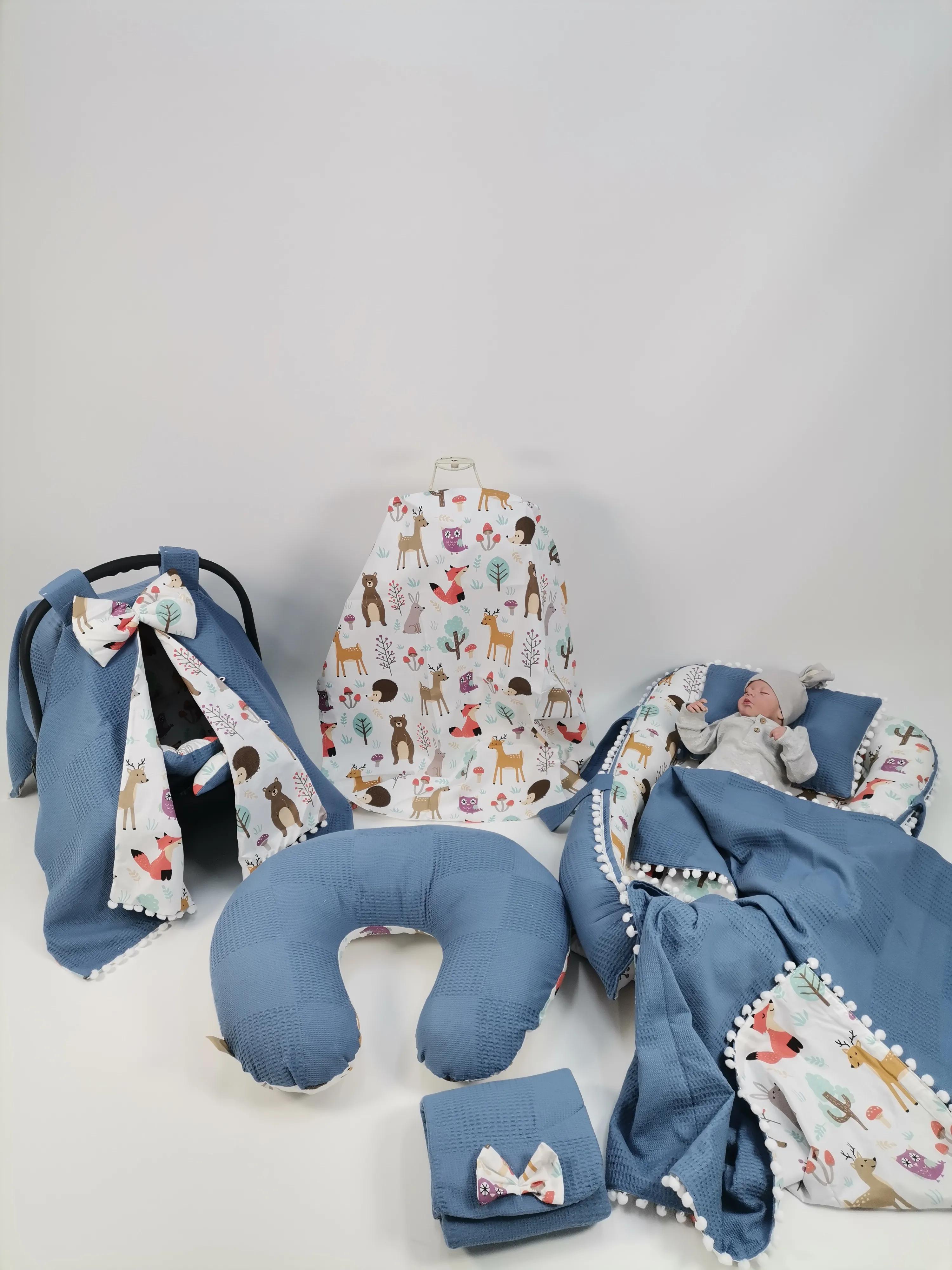 İndigo mavi waffle klasik pike ile hayvan figürlü poplin kumaşlardan üretilen 8 ’li Set içeriği;