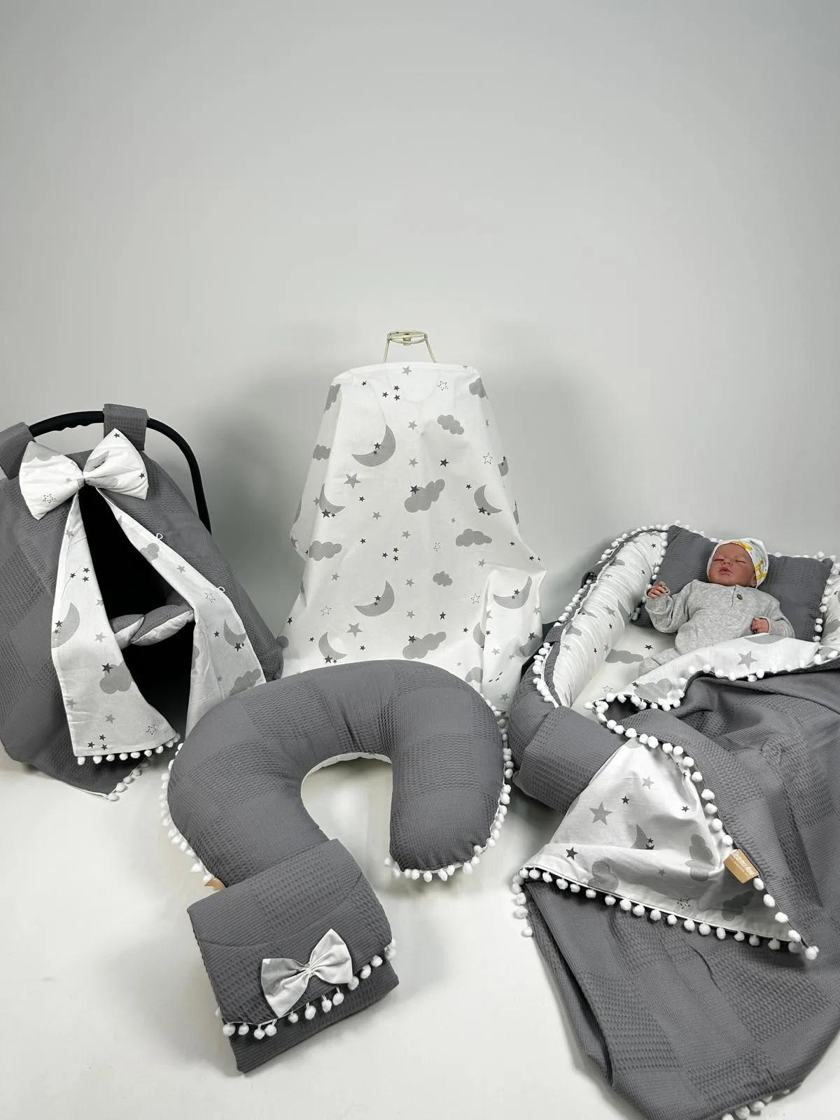 Babynest 8'li set koyu gri waffle pike - gri aylı bulutlu poplin