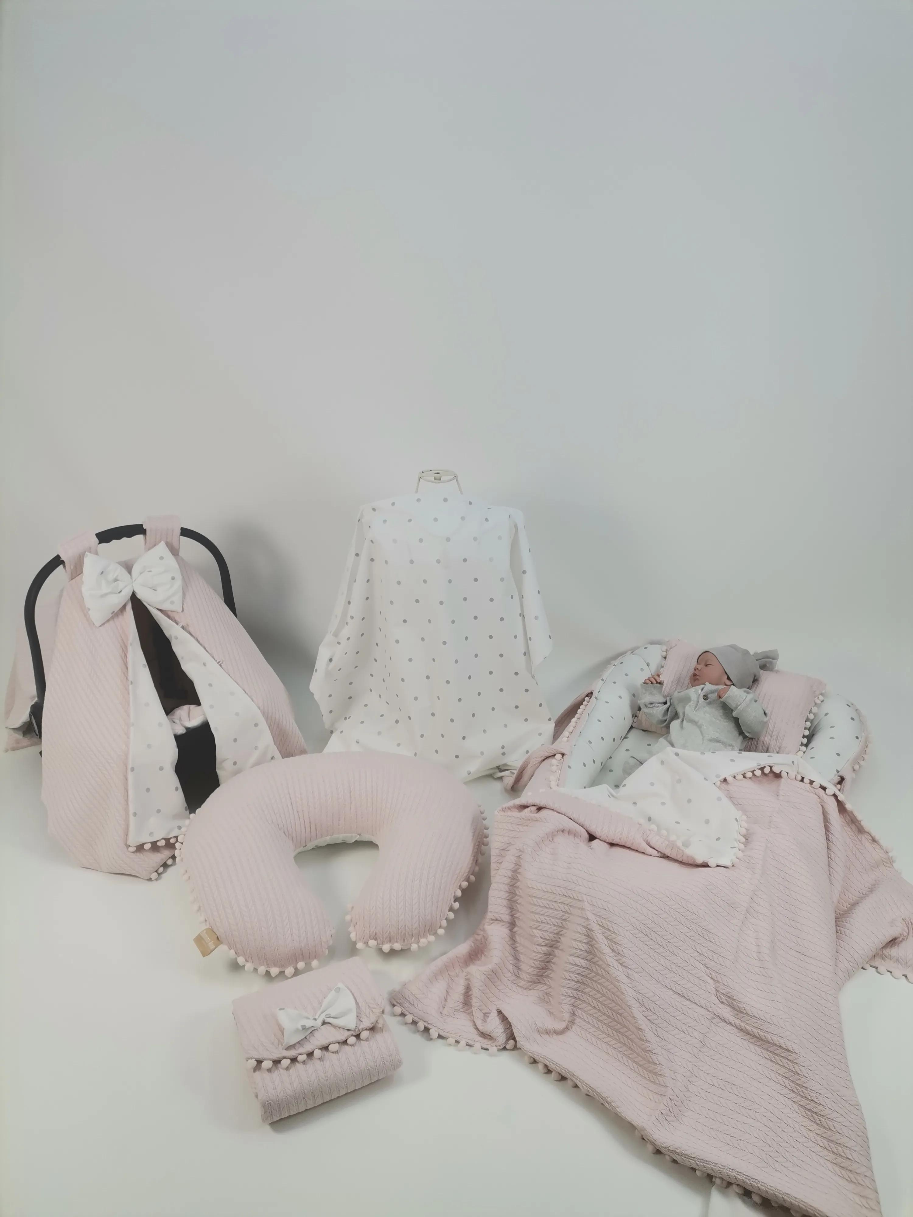 Pudra örgü pike ile Gümüş puantiyeli poplin kumaşlardan üretilen 8’li Set içeriği;