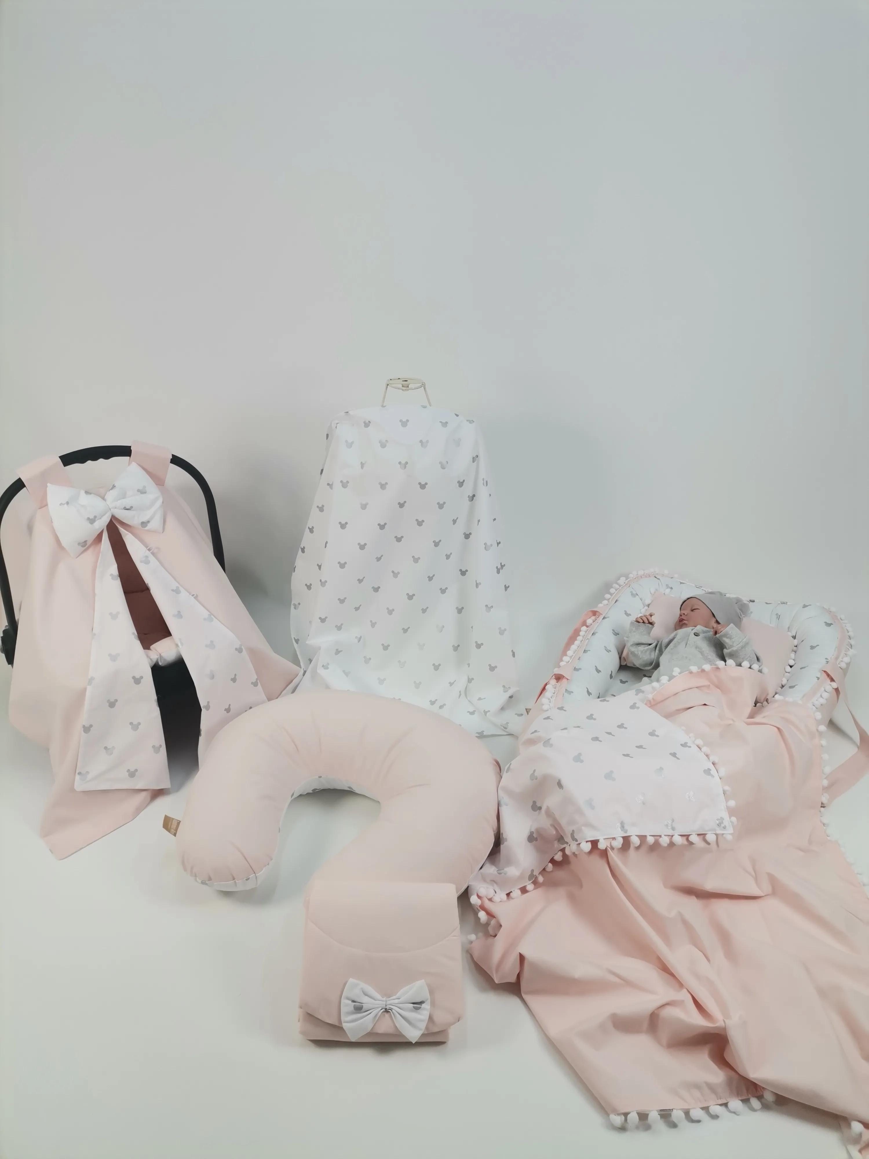 Somon rengi poplin ve gümüş mickey desenli kumaşlardan üretilen 8’li Set içeriği;
