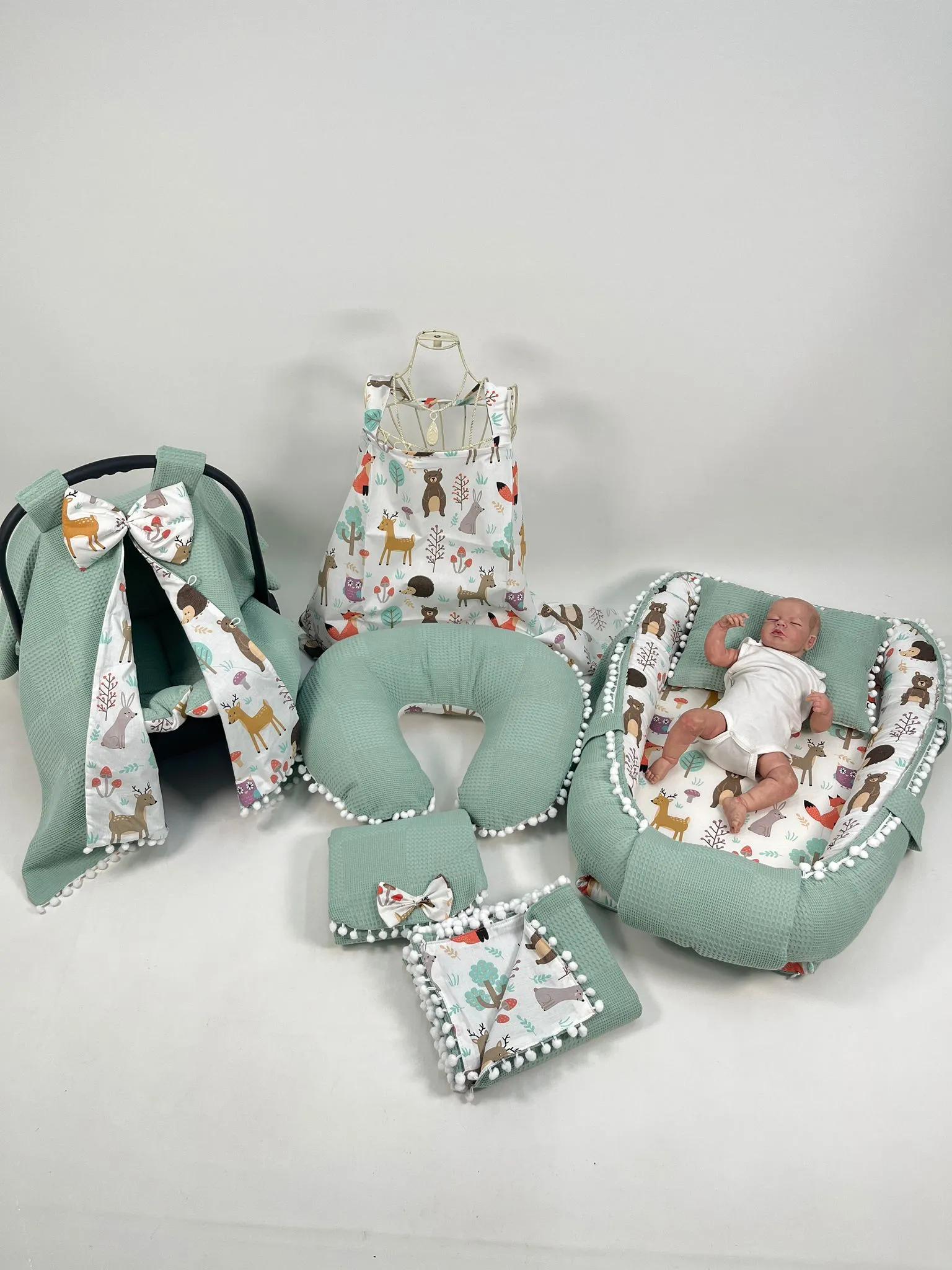 Yeşil waffle pike ile hayvan figürlü poplin kumaşlardan üretilen 8’li Set içeriği;