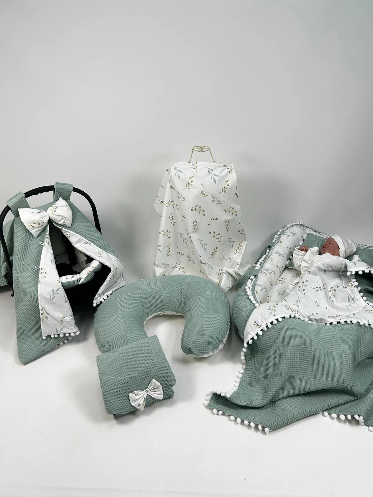 Babynest 8'li set yeşil waffle pike - yeşil zeytindalı desenli poplin
