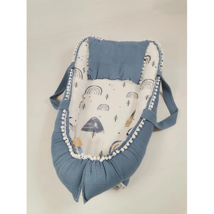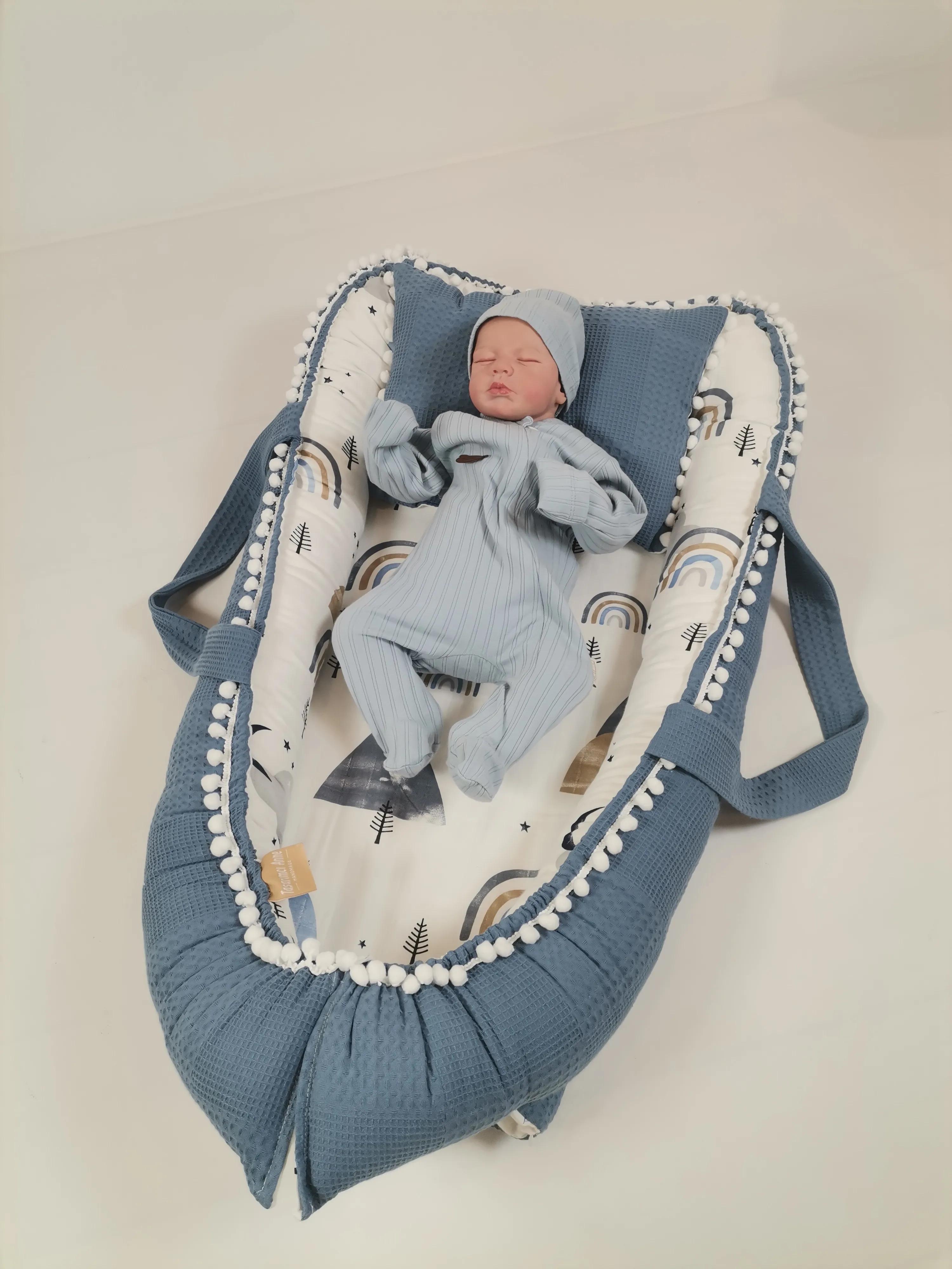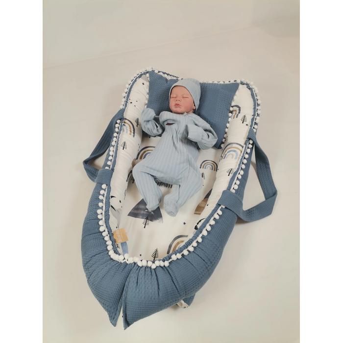 İndigo mavi waffle pike ve yeni bej gri mavi gokkusaklı poplin kumaşlardan üretilen beyaz ponponlu Babynestimiz ;