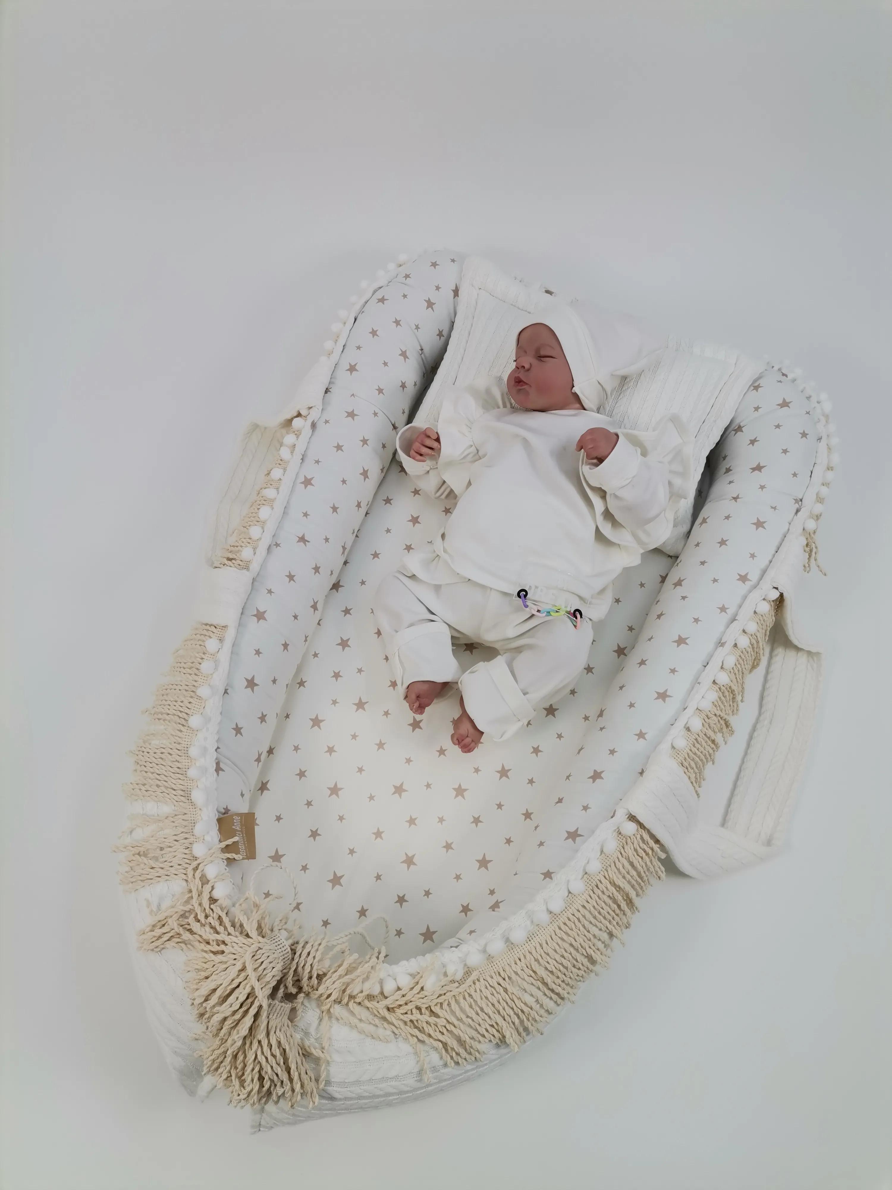 Krem örgü pike ve krem rengi poplin kumaştan üretilen püskül ve ponpon detaylı babynestimiz ;