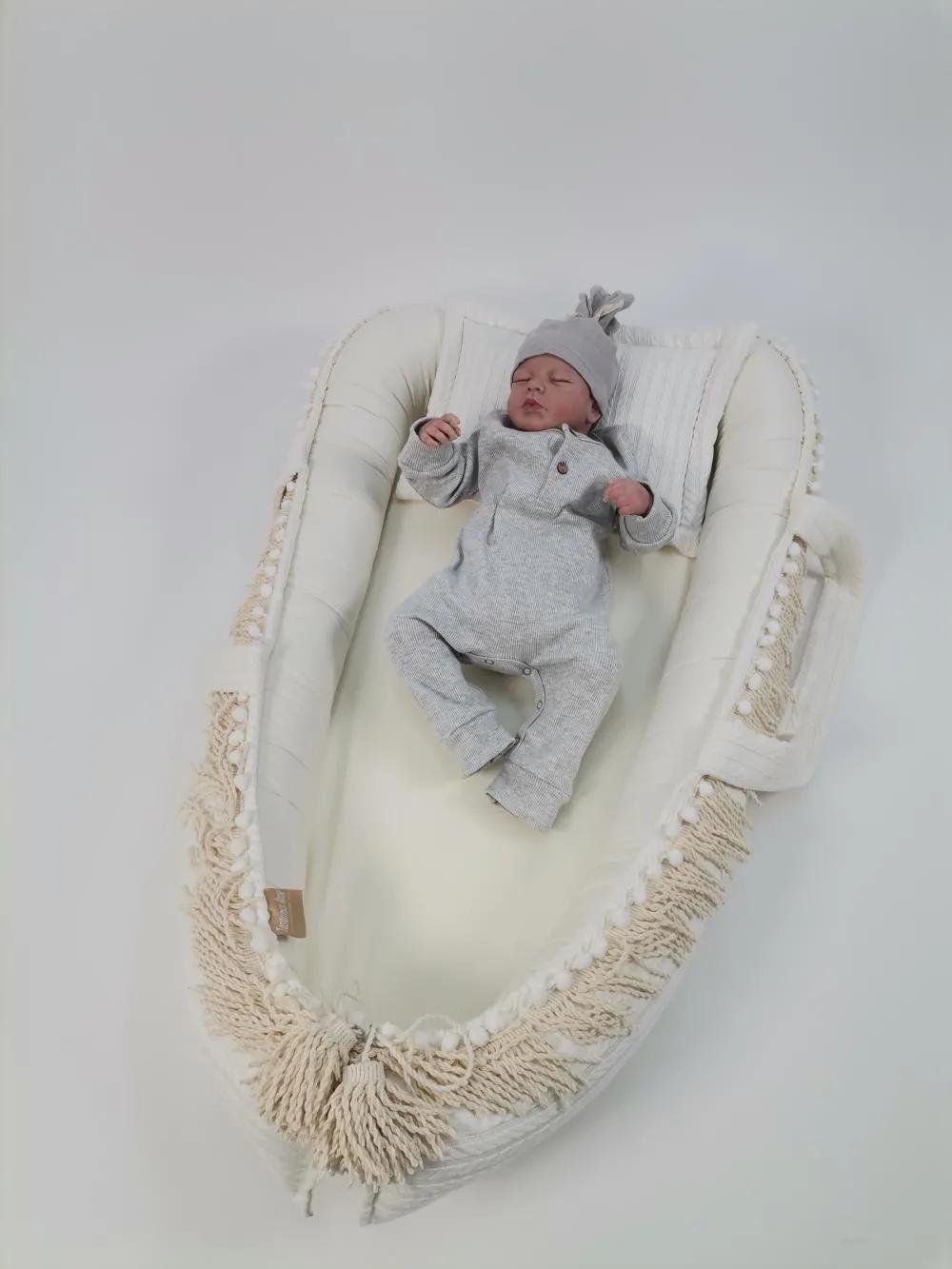 Krem örgü pike ve krem rengi poplin kumaştan üretilen  püskül ve ponpon detaylı babynestimiz ;