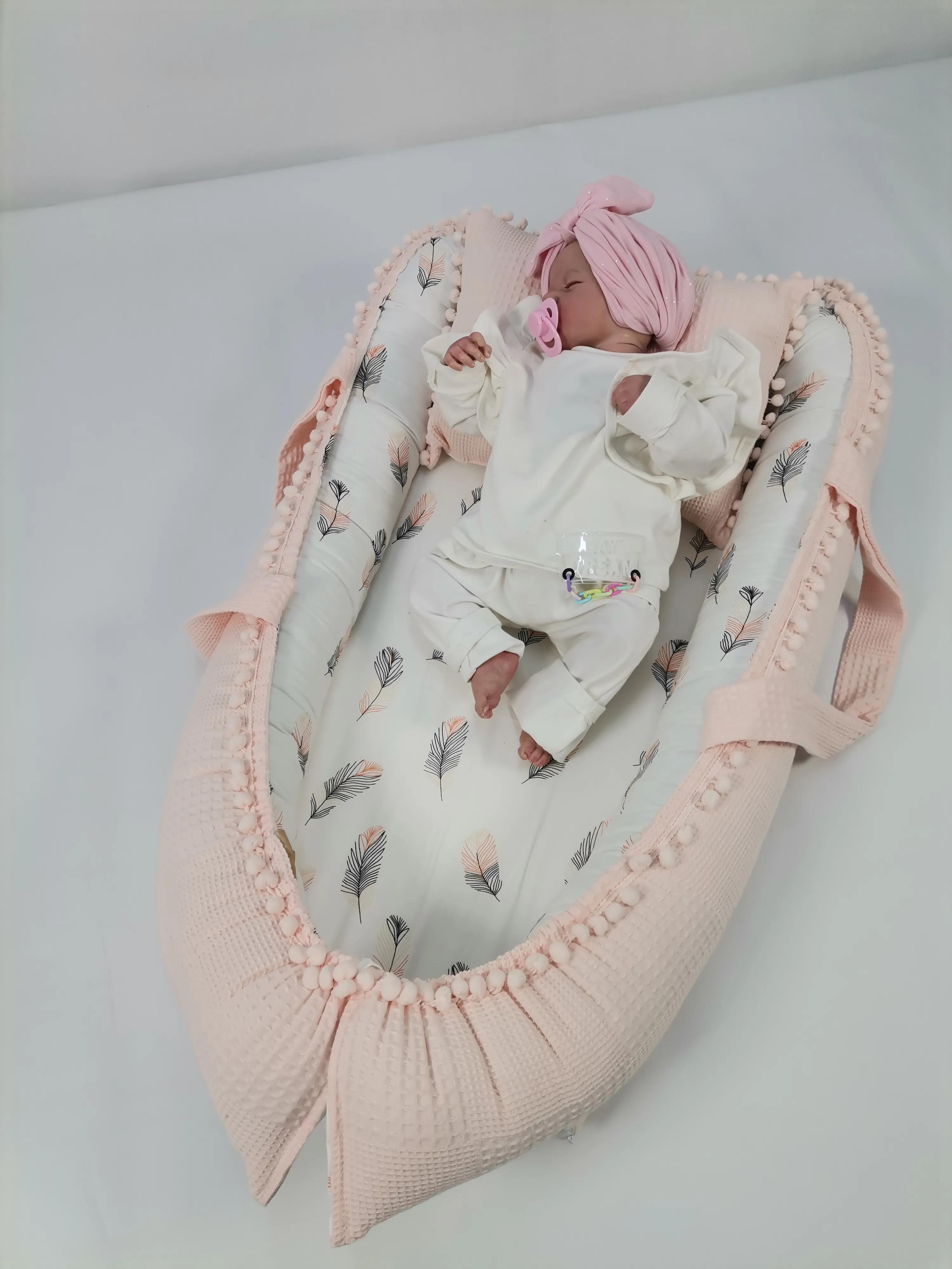 Waffle pike ve poplin kumaşlardan üretilen beyaz ponponlu Babynestimiz ;