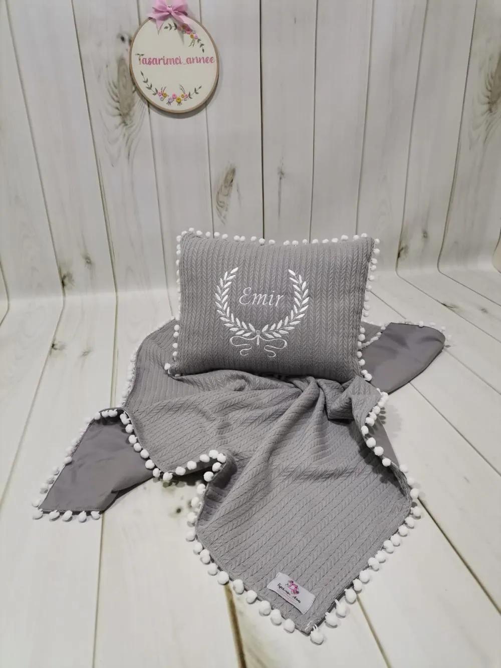 Gri Örgü ve Gri Poplin kumaştan üretilen Ponponlu Battaniye, Nakış ve İsim İşlemeli Yastık