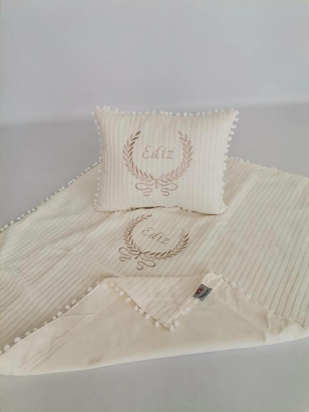İsim ve Nakış işlemeli Ponponlu Battaniye ve İsim ve Nakış işlemli ponponlu Yastık