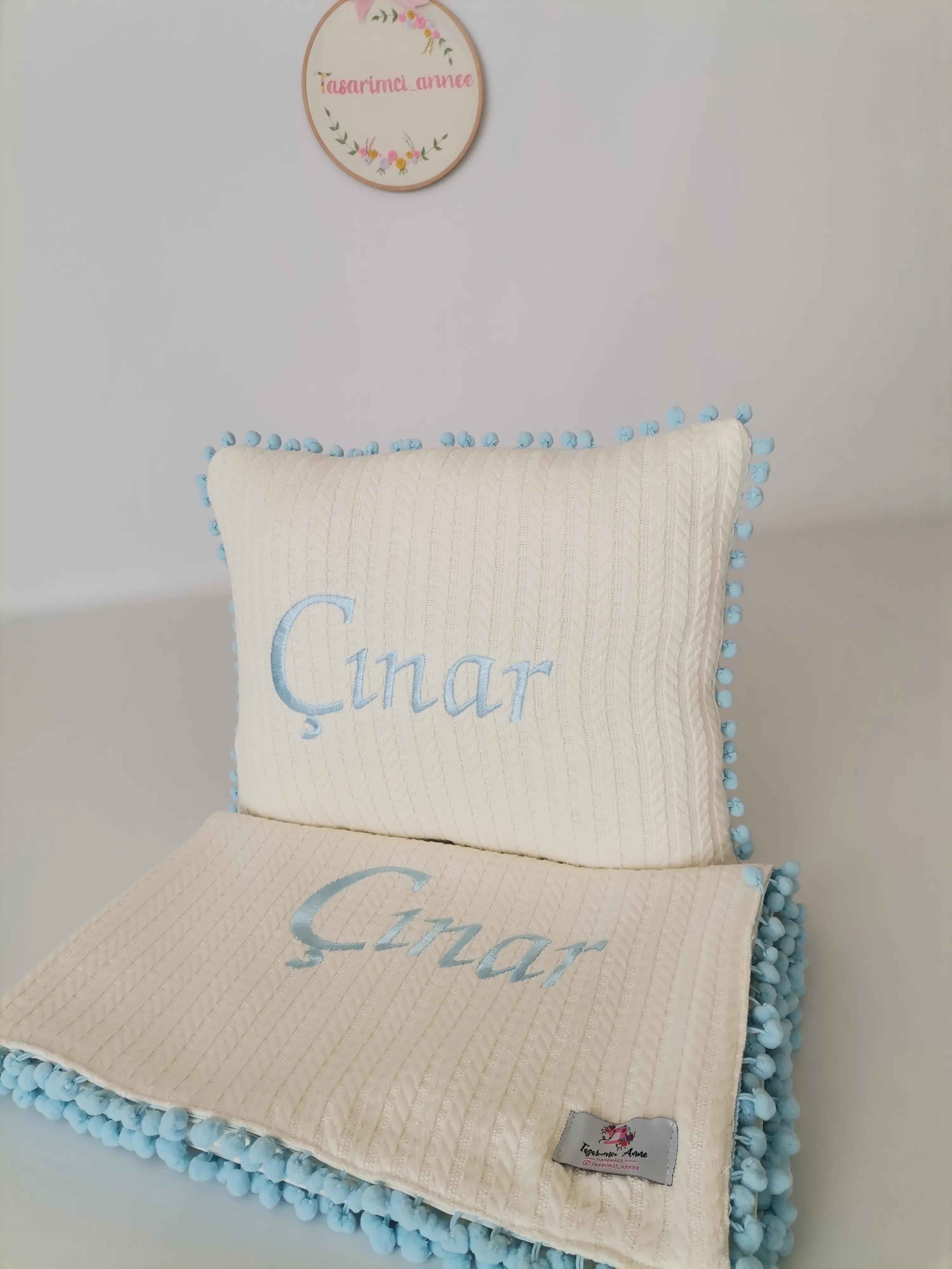Krem Örgü pike ve krem rengi poplin kumaştan üretilen,mavi ponponlu İsim işlemeli Battaniye ile İsim işlemeli mavi ponponlu Yastık