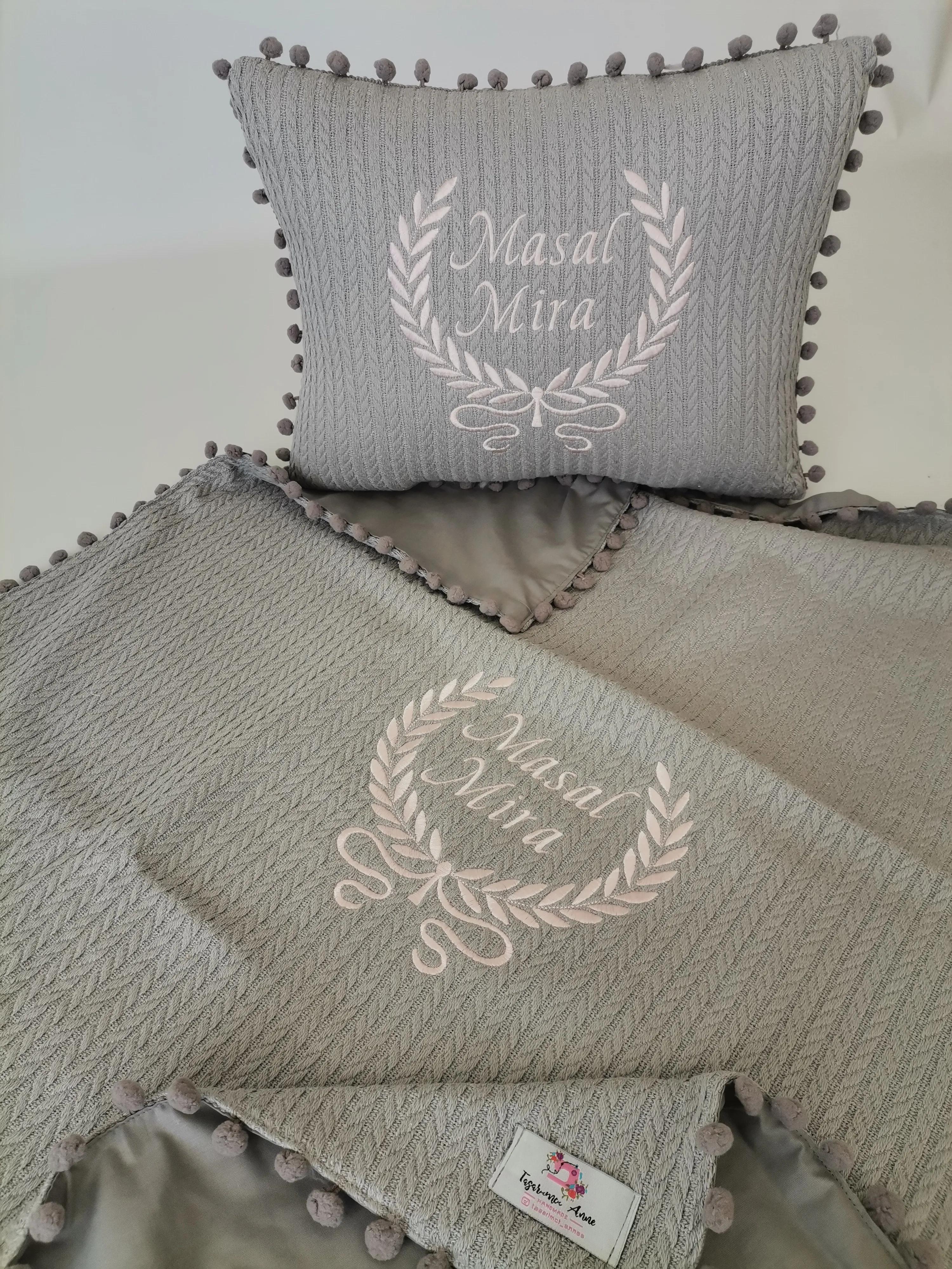 Gri Örgü ve Gri Poplin kumaştan üretilen Ponponlu Battaniye, Nakış ve İsim İşlemeli Yastık
