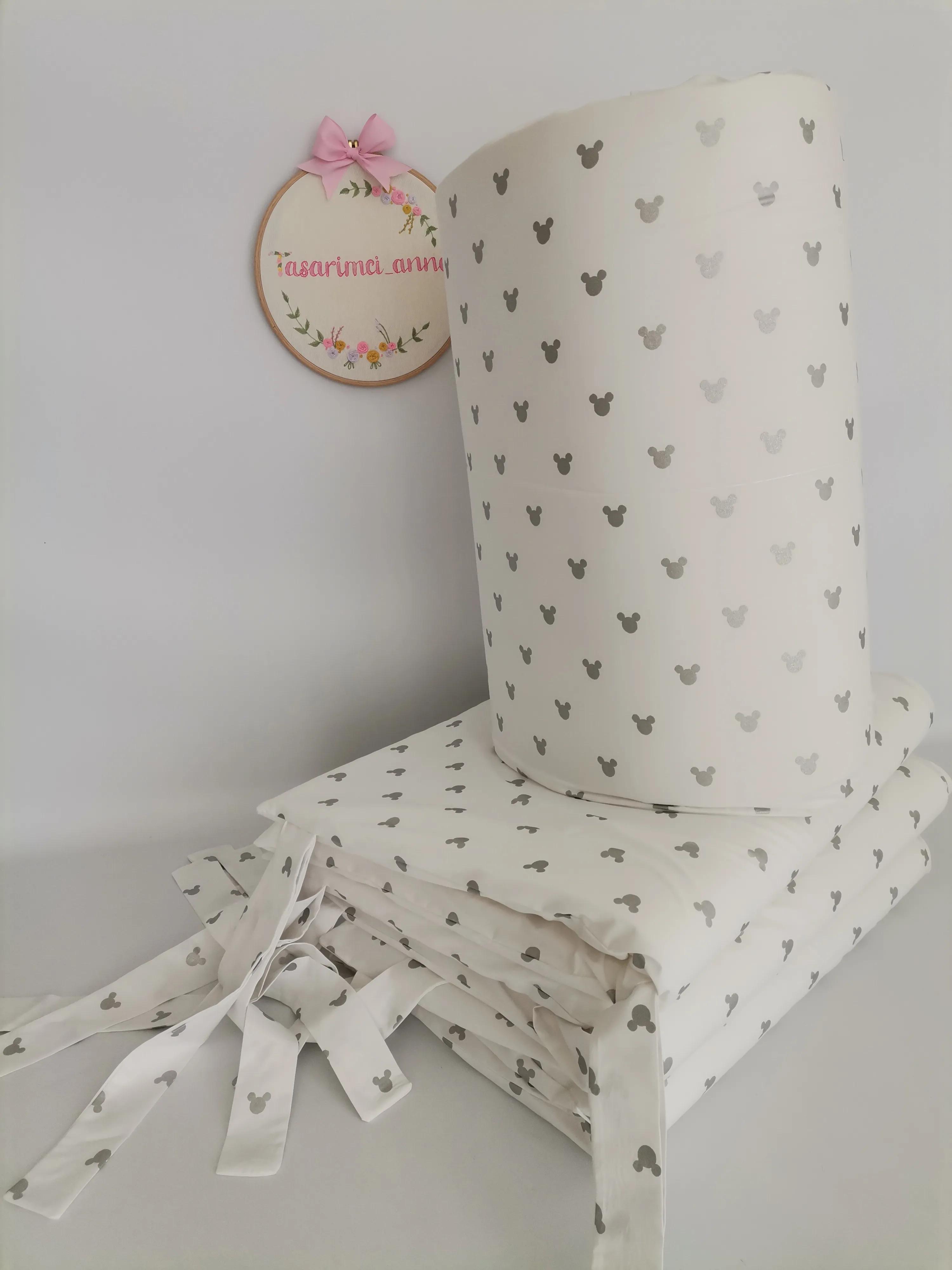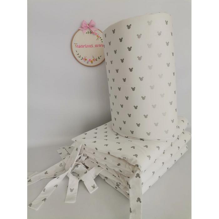 Gümüş mickey desenli poplin kumaştan üretilen 4 parça korumalık ;