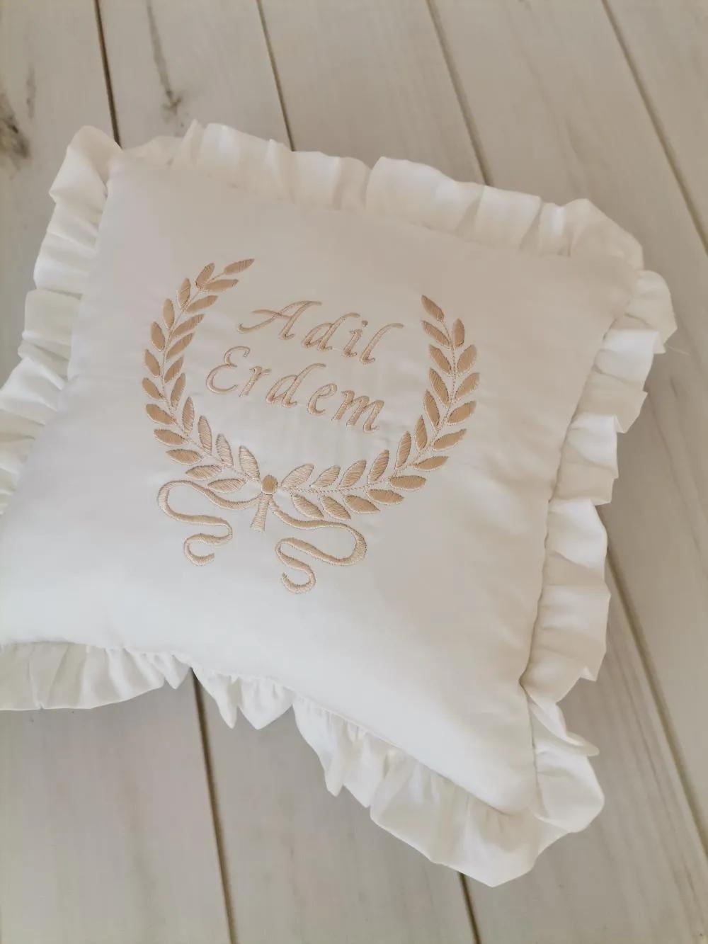 Beyaz Poplin kumaştan üretilen Nakış ve İsim İşlemeli Yastık