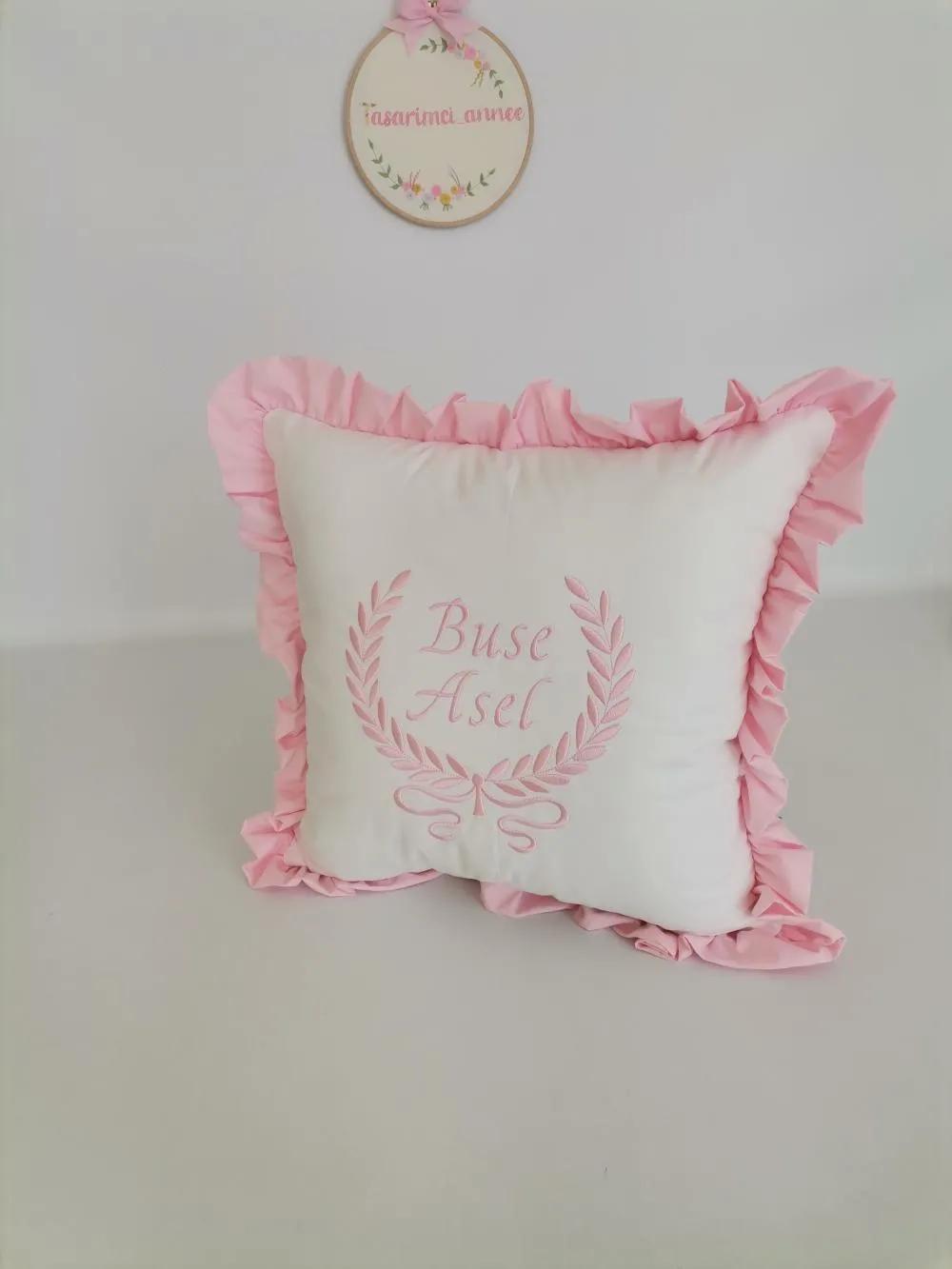 Beyaz Poplin kumaştan üretilen fırfırlı, fiyonklu , Nakış ve İsim İşlemeli Yastık