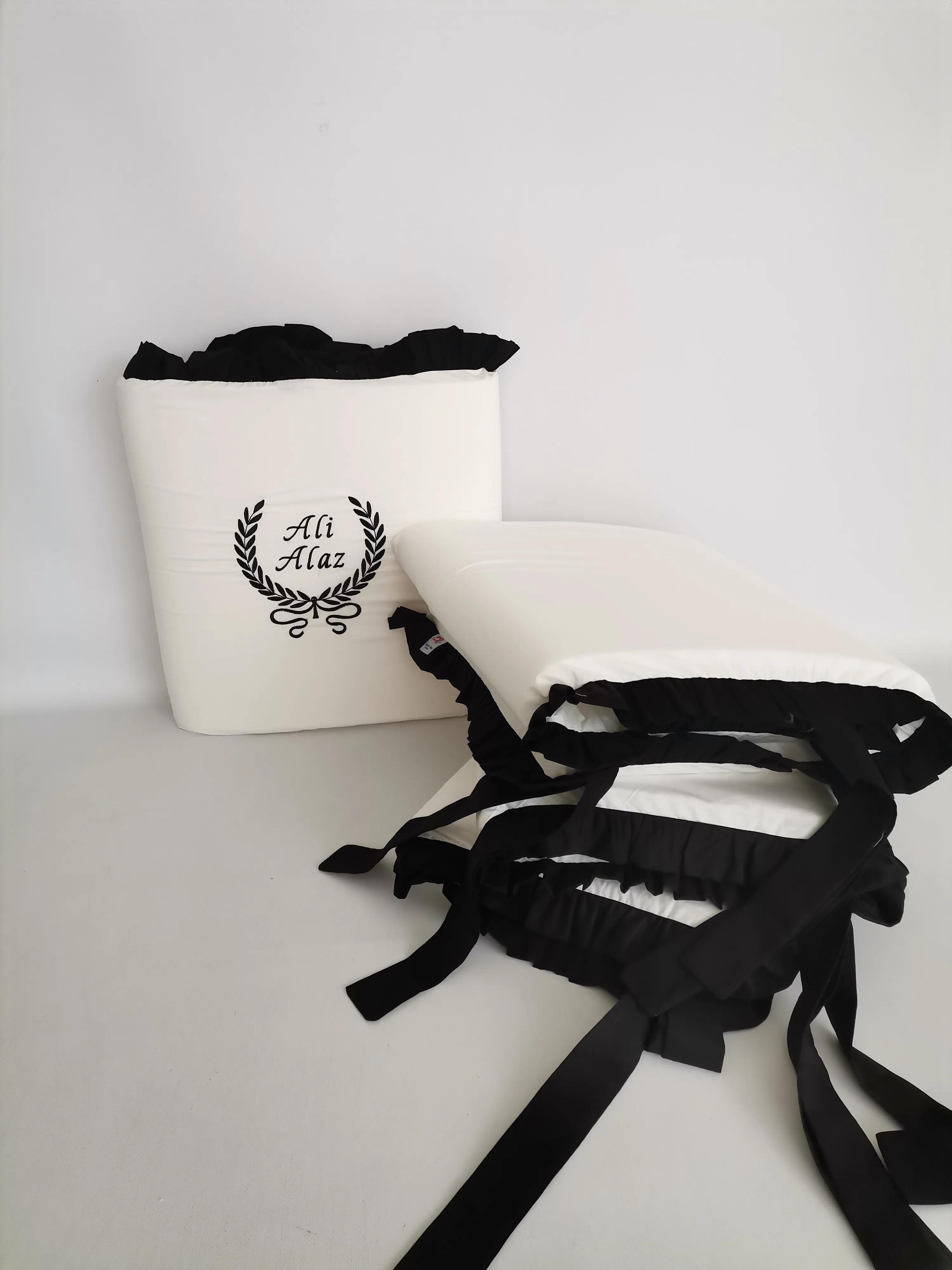 Beyaz ve siyah fırfırlı poplin kumaştan üretilmiş fırfır detaylı 4 parça korumalık
