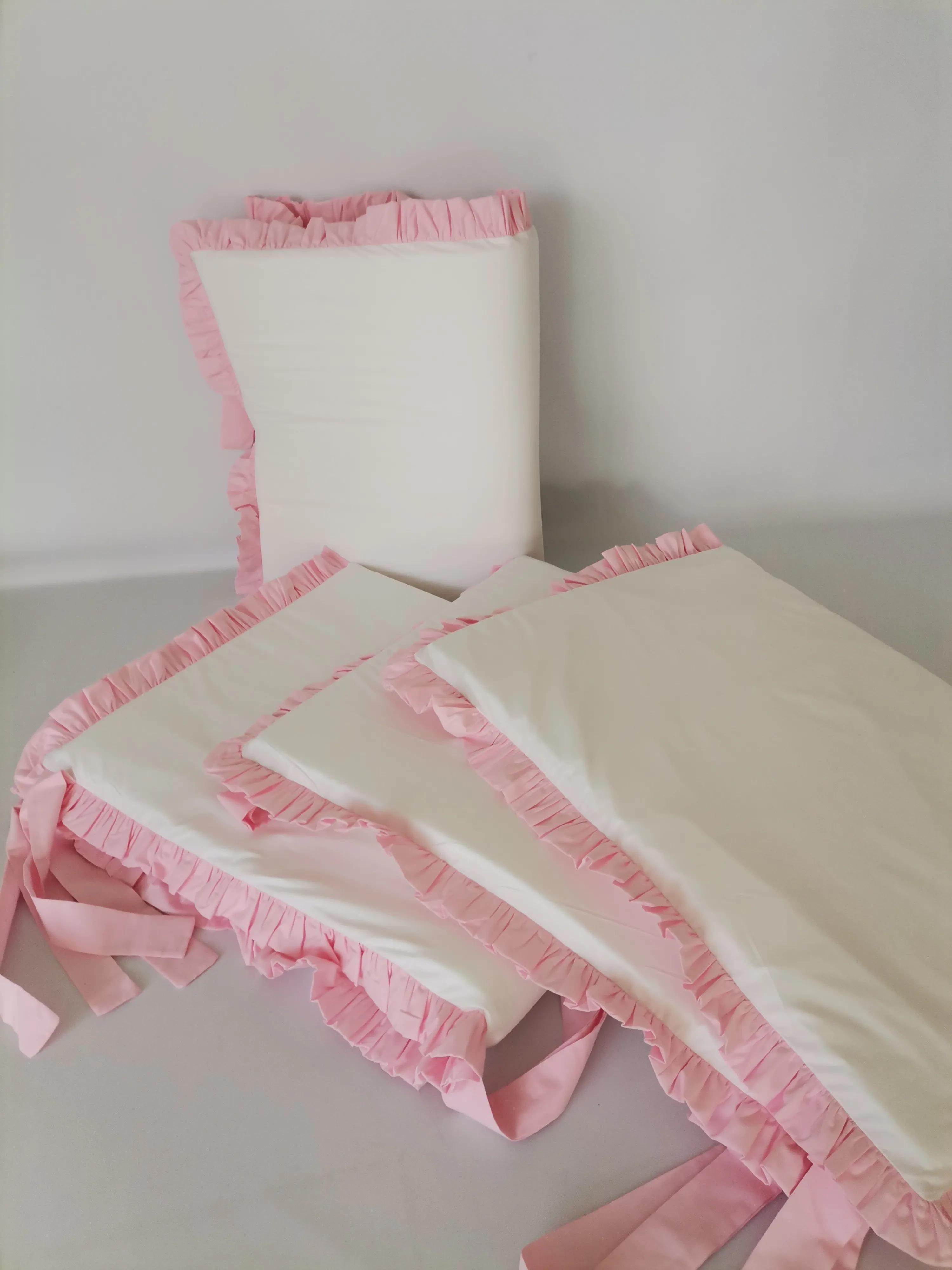 Beyaz ve v29 pembe Poplin kumaştan üretilmiş fırfır detaylı 4 parça korumalık