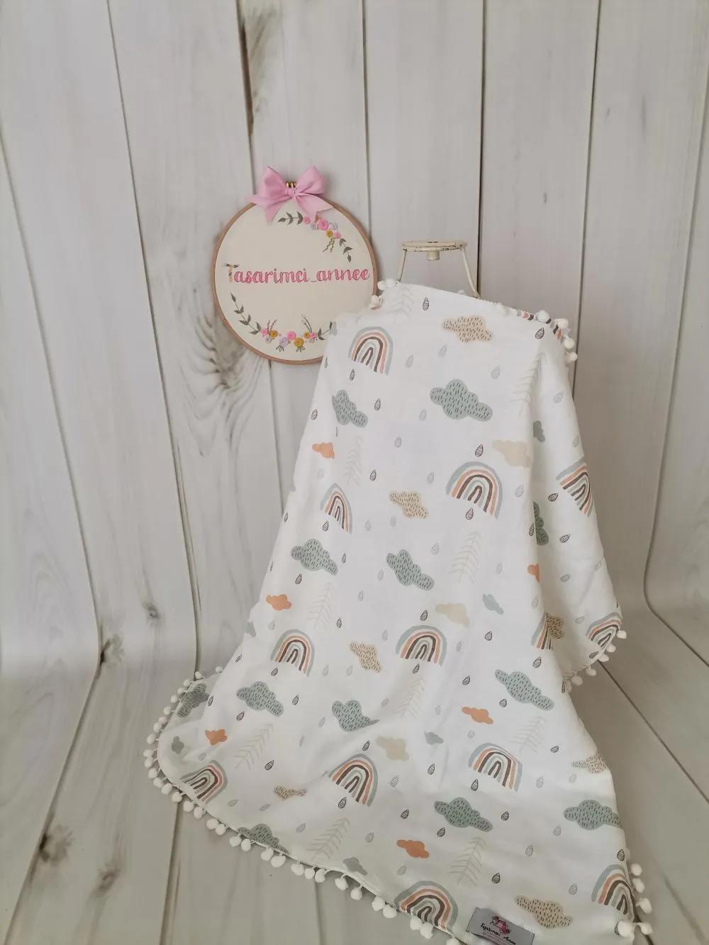 Gökkuşağı desenli ÇİFT KAT Müslinden üretilen Ponponlu Emzirme Önlüğü ;
