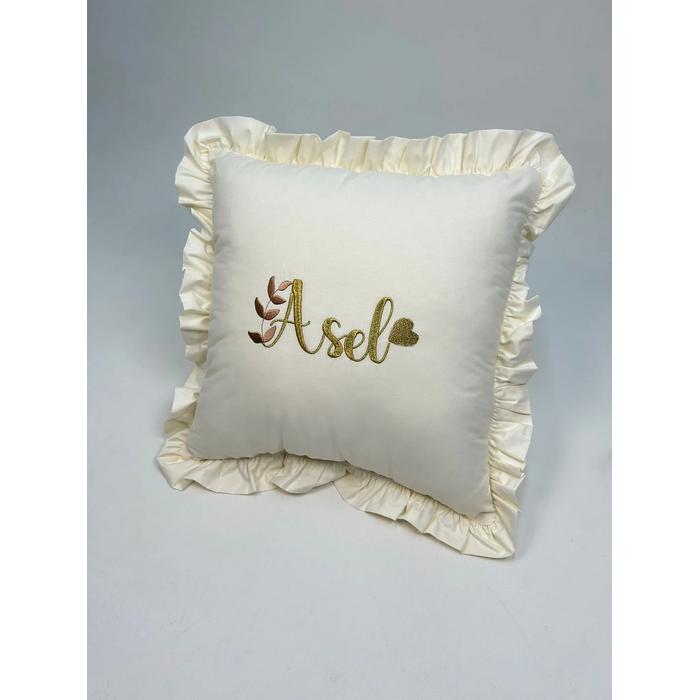 Krem Poplin kumaştan üretilen isim işlemeli,fırfırlı kare Yastık