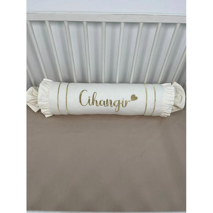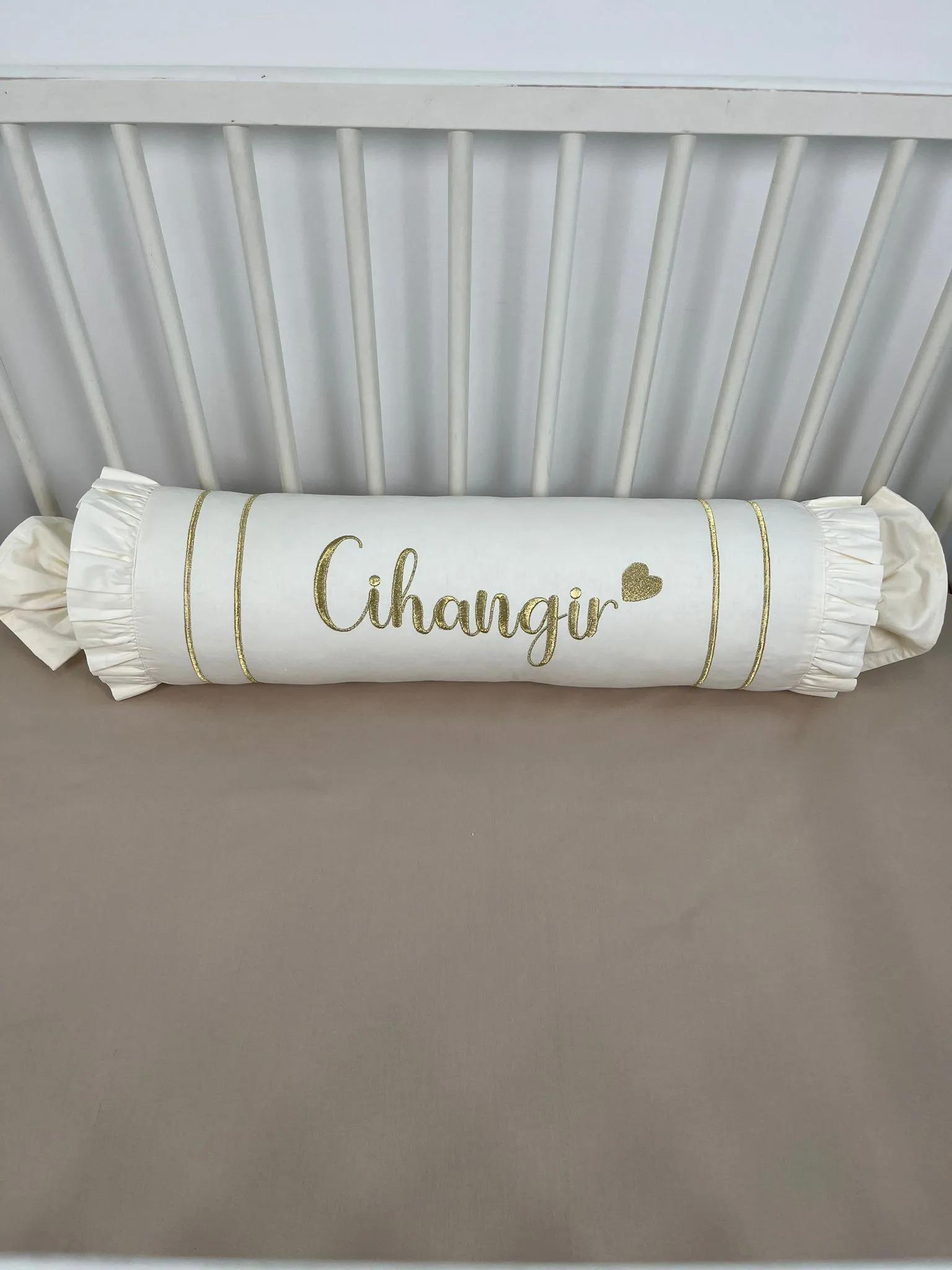 Krem Poplin kumaştan üretilen isim işlemeli,fırfırlı ve pikolu şeker Yastık
