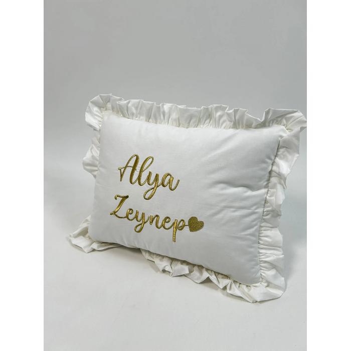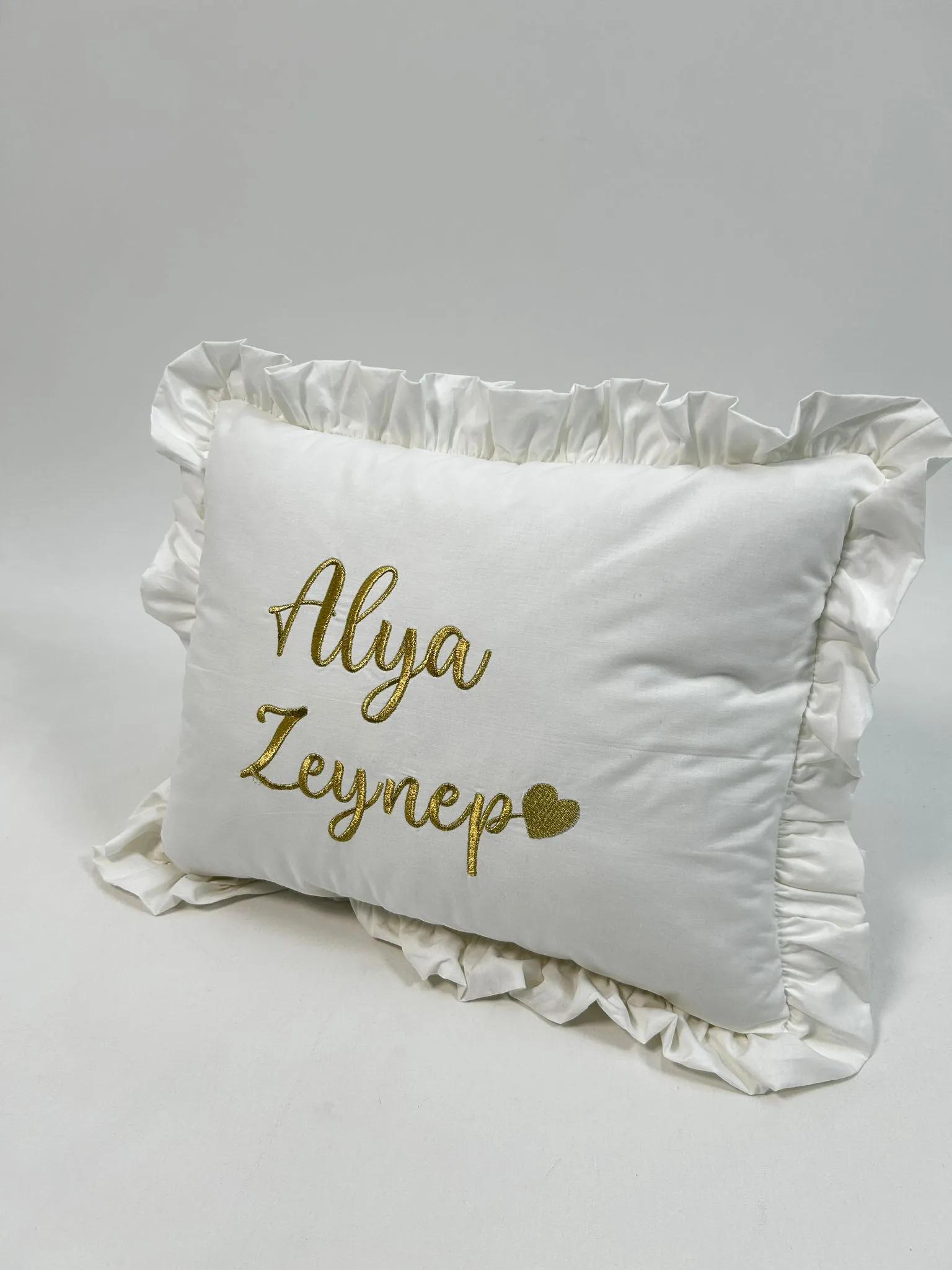 Poplin kumaştan üretilen isim ve kalp işlemeli fırfırlı süs Yastık