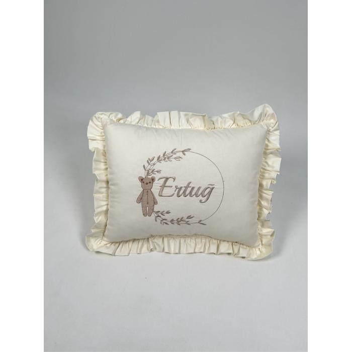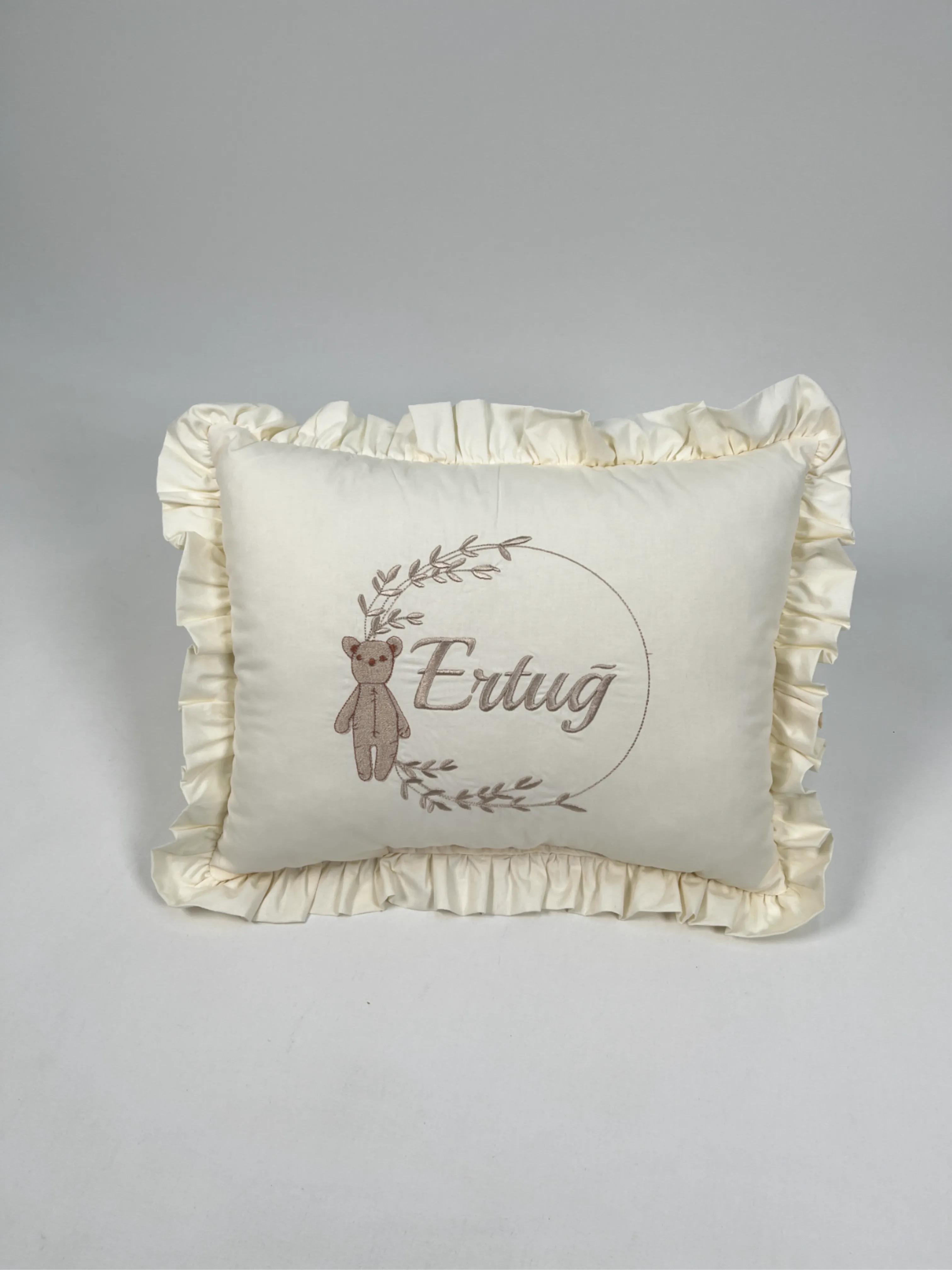 Poplin kumaştan üretilen isim ve desen işlemeli fırfırlı süs Yastık