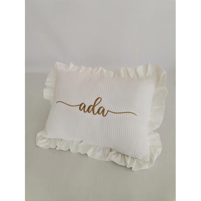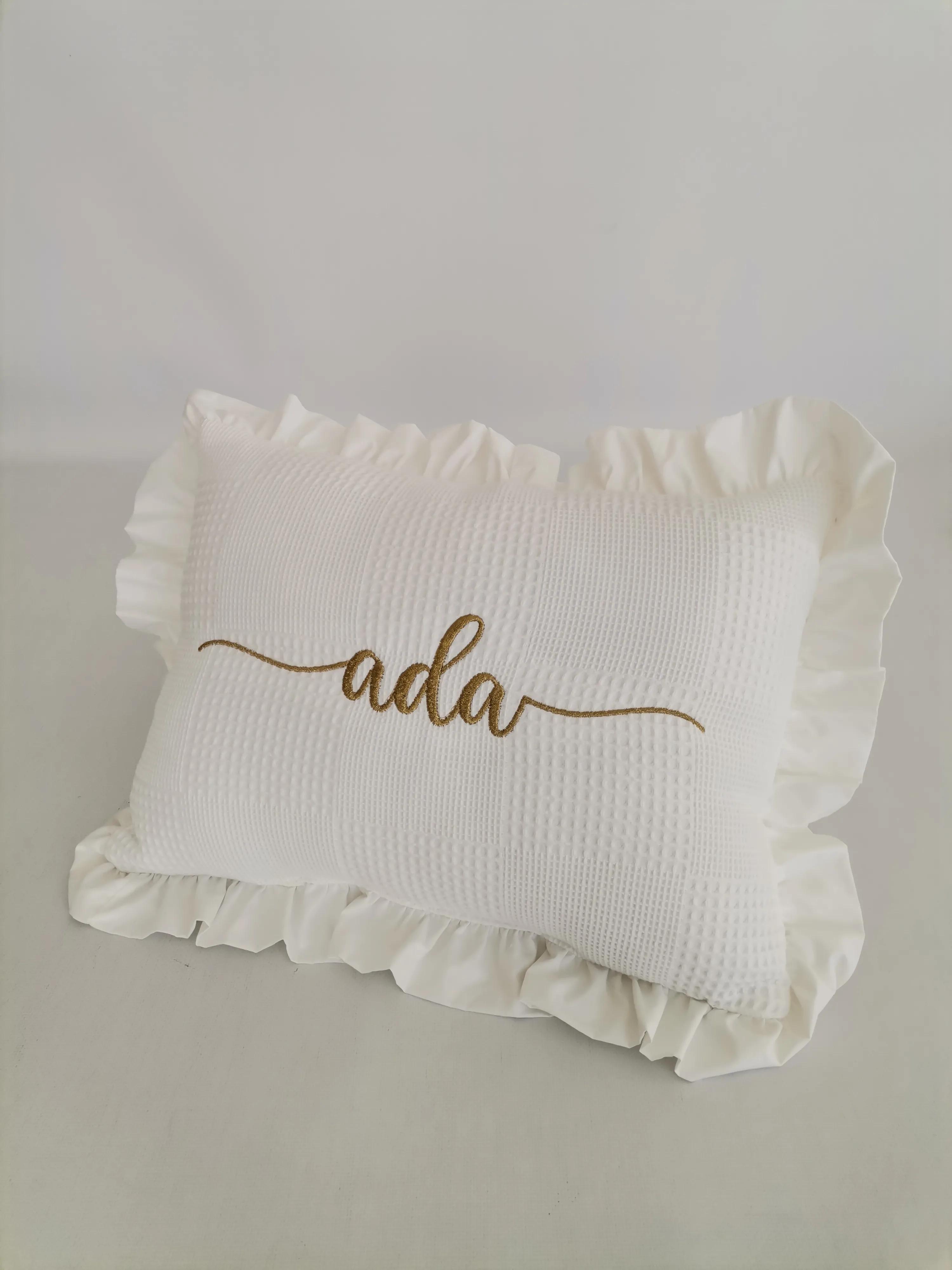 Beyaz waffle klasik pike ve beyaz Poplin kumaştan üretilen isim işlemeli fırfırlı süs Yastık