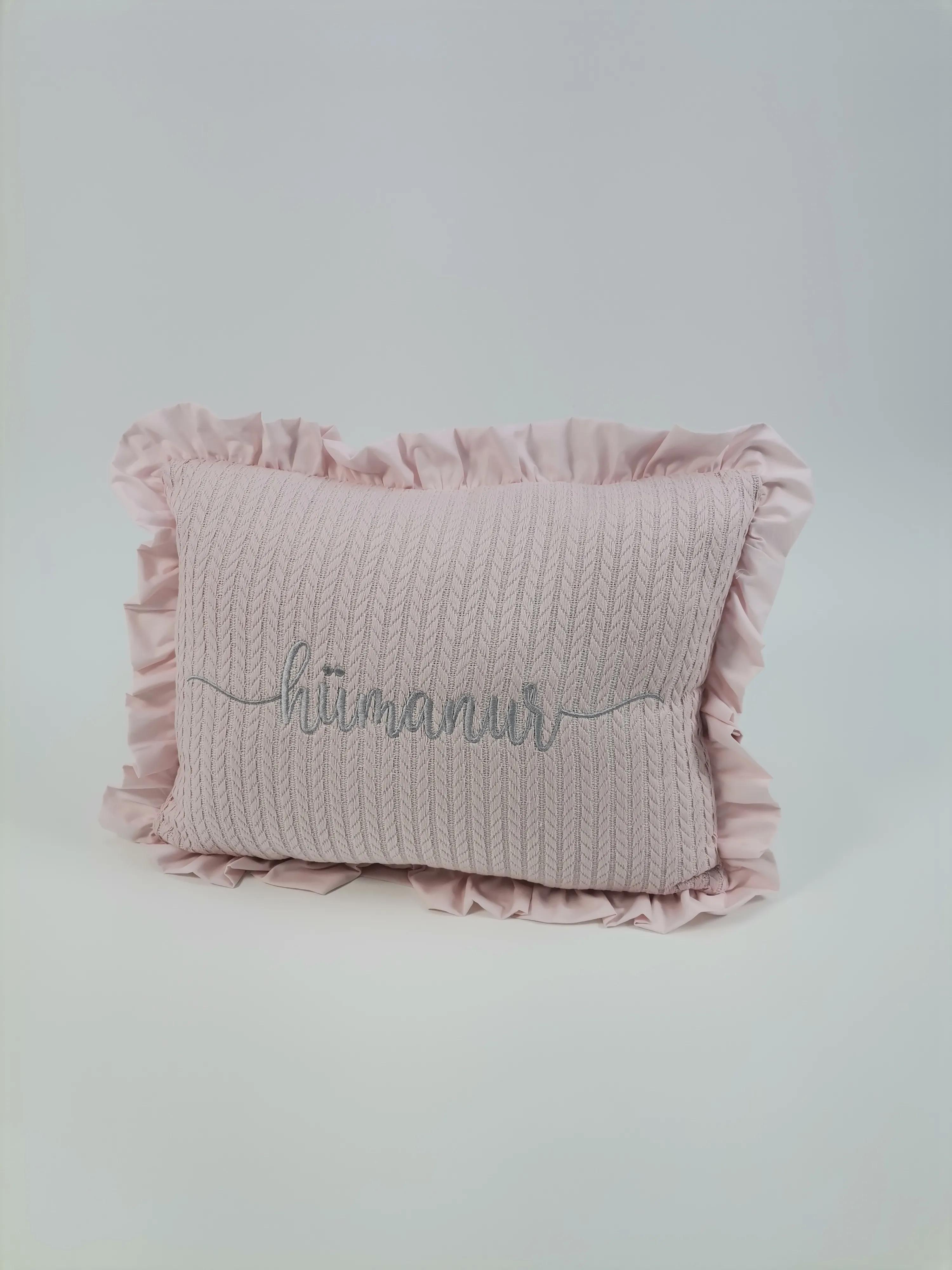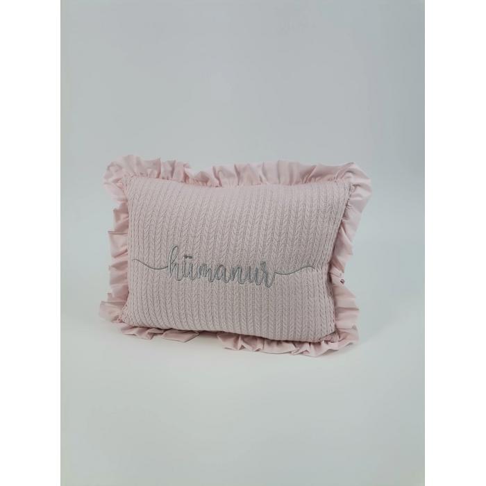Örgü pike ve Poplin kumaştan üretilen isim işlemeli fırfırlı süs Yastık
