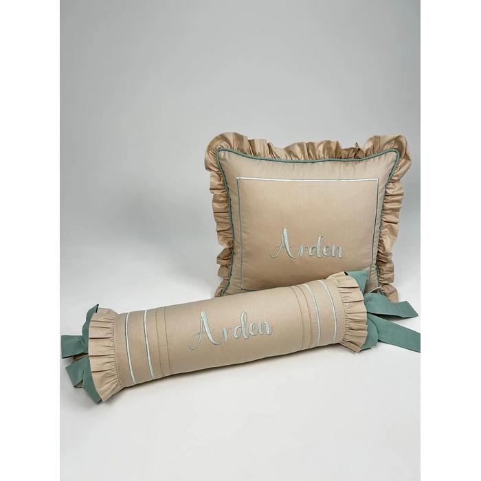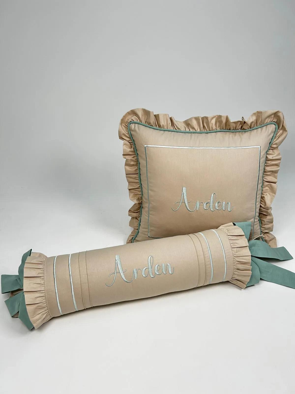 Beyaz Poplin kumaştan üretilen isim işlemeli fitilli ,fırfırlı ve pikolu kare süs Yastık