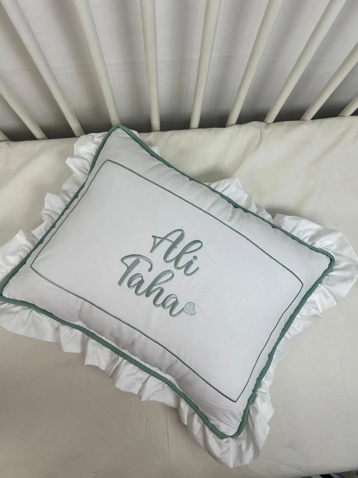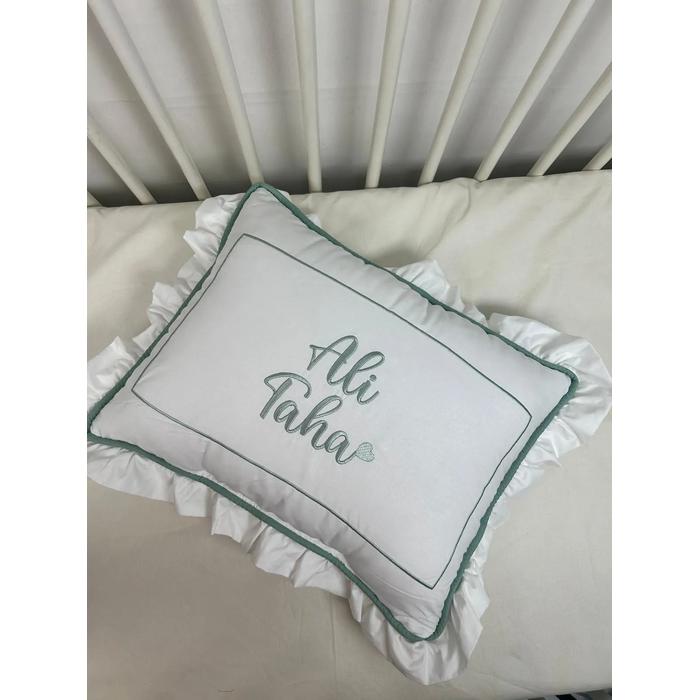 Beyaz Poplin kumaştan üretilen isim işlemeli fitilli ve fırfırlı süs Yastık