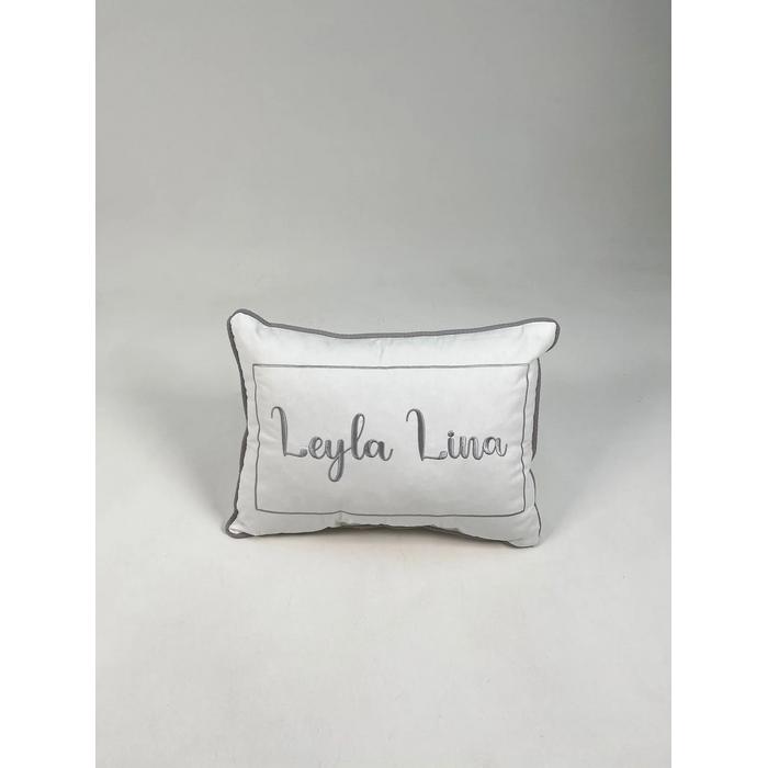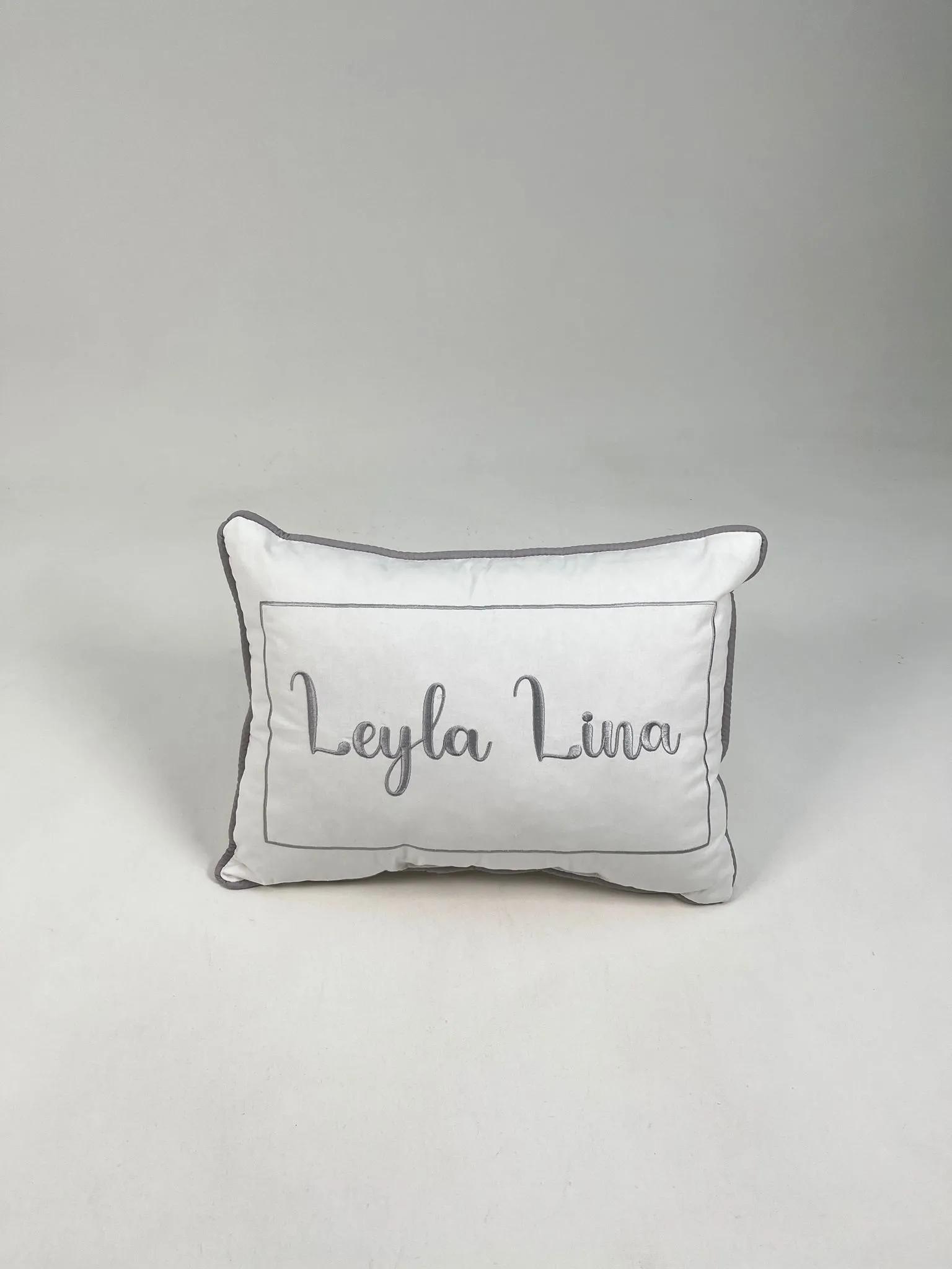 Beyaz Poplin kumaştan üretilen isim işlemeli fitilli süs Yastık