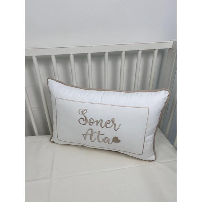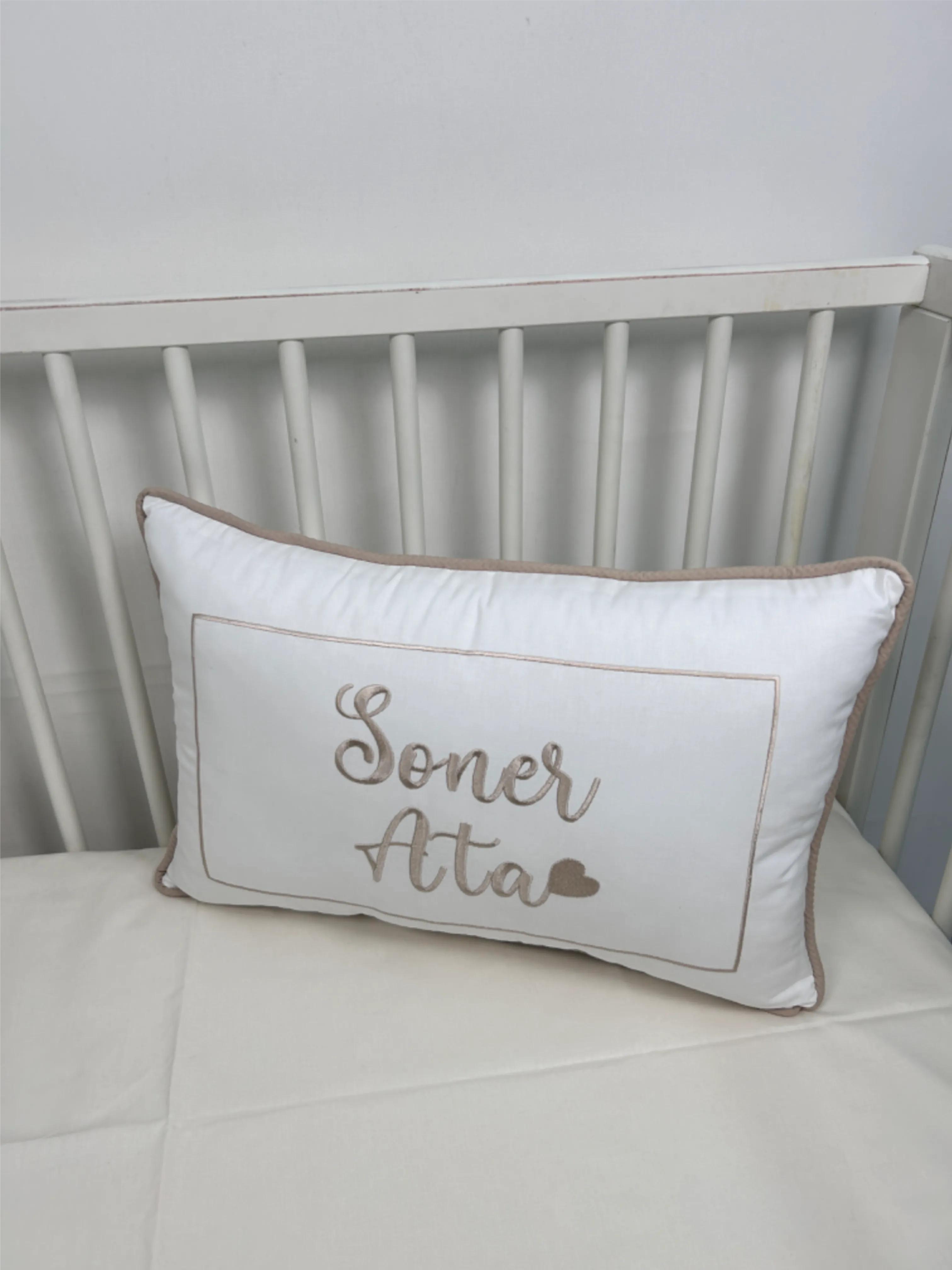 Beyaz Poplin kumaştan üretilen isim işlemeli fitilli süs Yastık