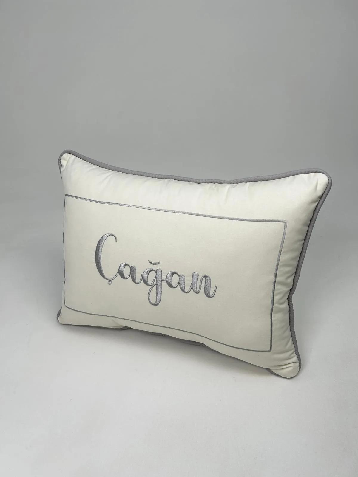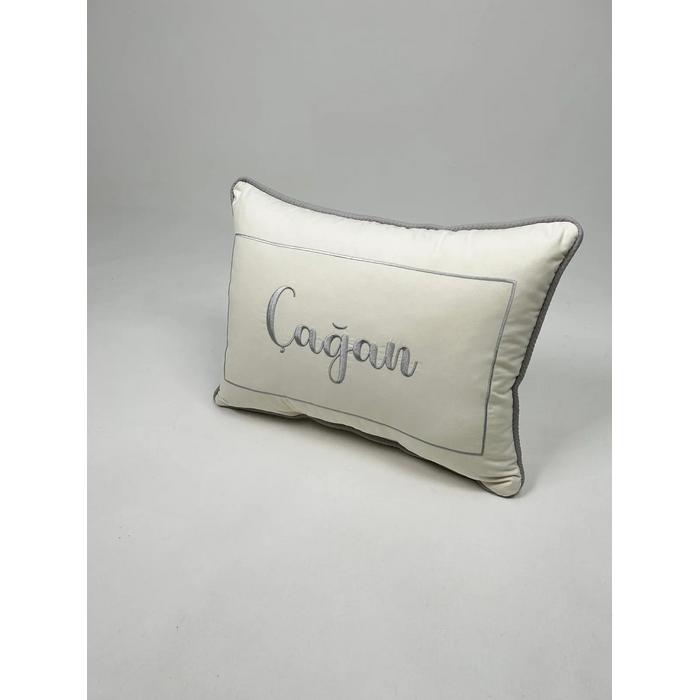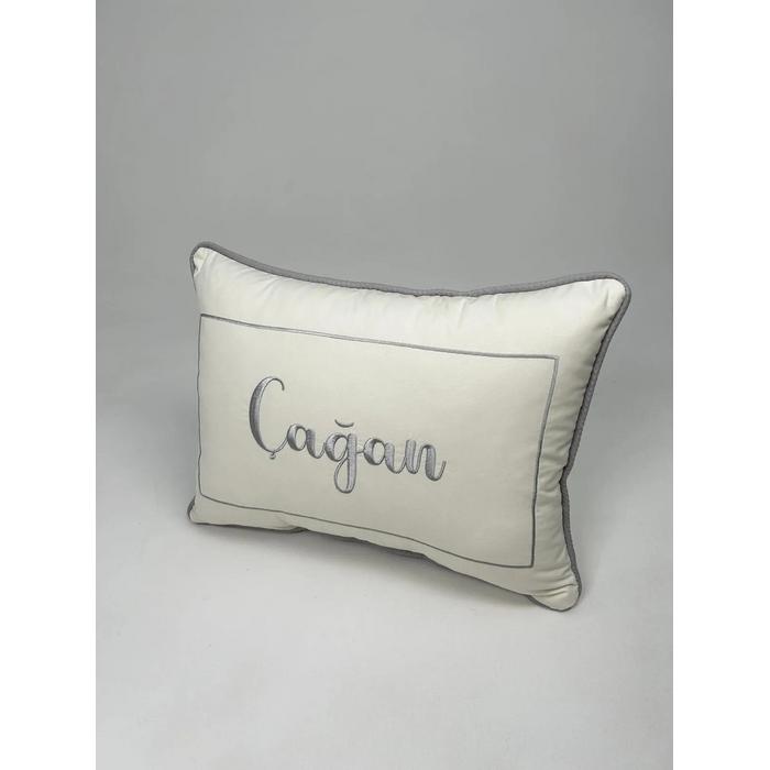 Krem Poplin kumaştan üretilen isim ve balon deseni işlemeli fitilli süs Yastık