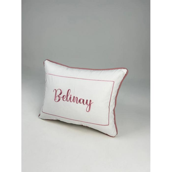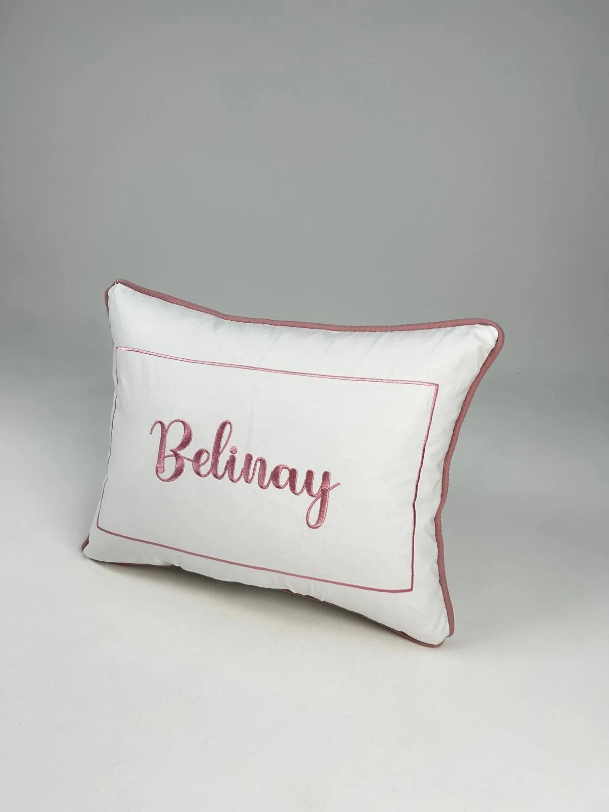 Beyaz Poplin kumaştan üretilen isim ve balon deseni işlemeli fitilli süs Yastık