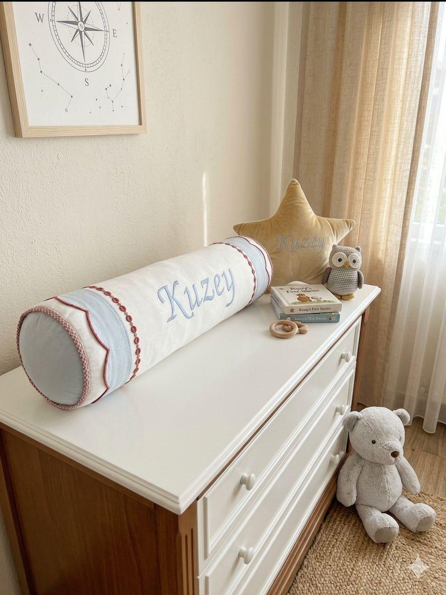 Beyaz Poplin kumaştan üretilen isim işlemeli,fırfırlı ve pikolu şeker Yastık