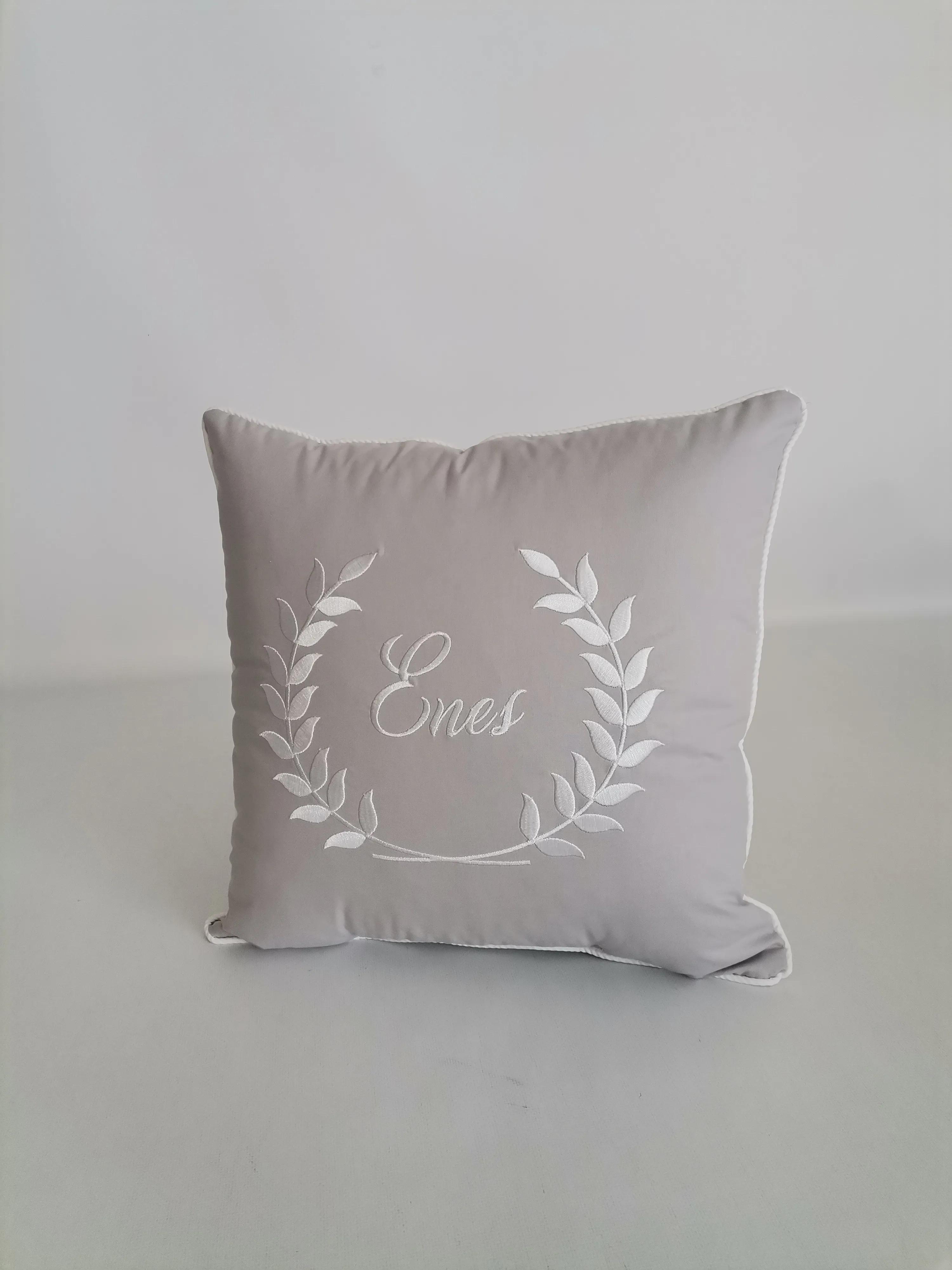Gri Poplin kumaştan üretilen beyaz fitilli , Nakış ve İsim İşlemeli Yastık