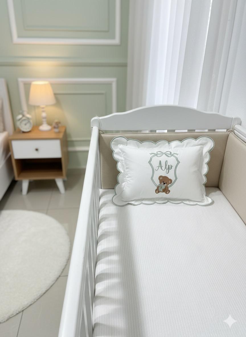 Beyaz Poplin kumaştan üretilen isim ve desen işlemeli süs Yastık