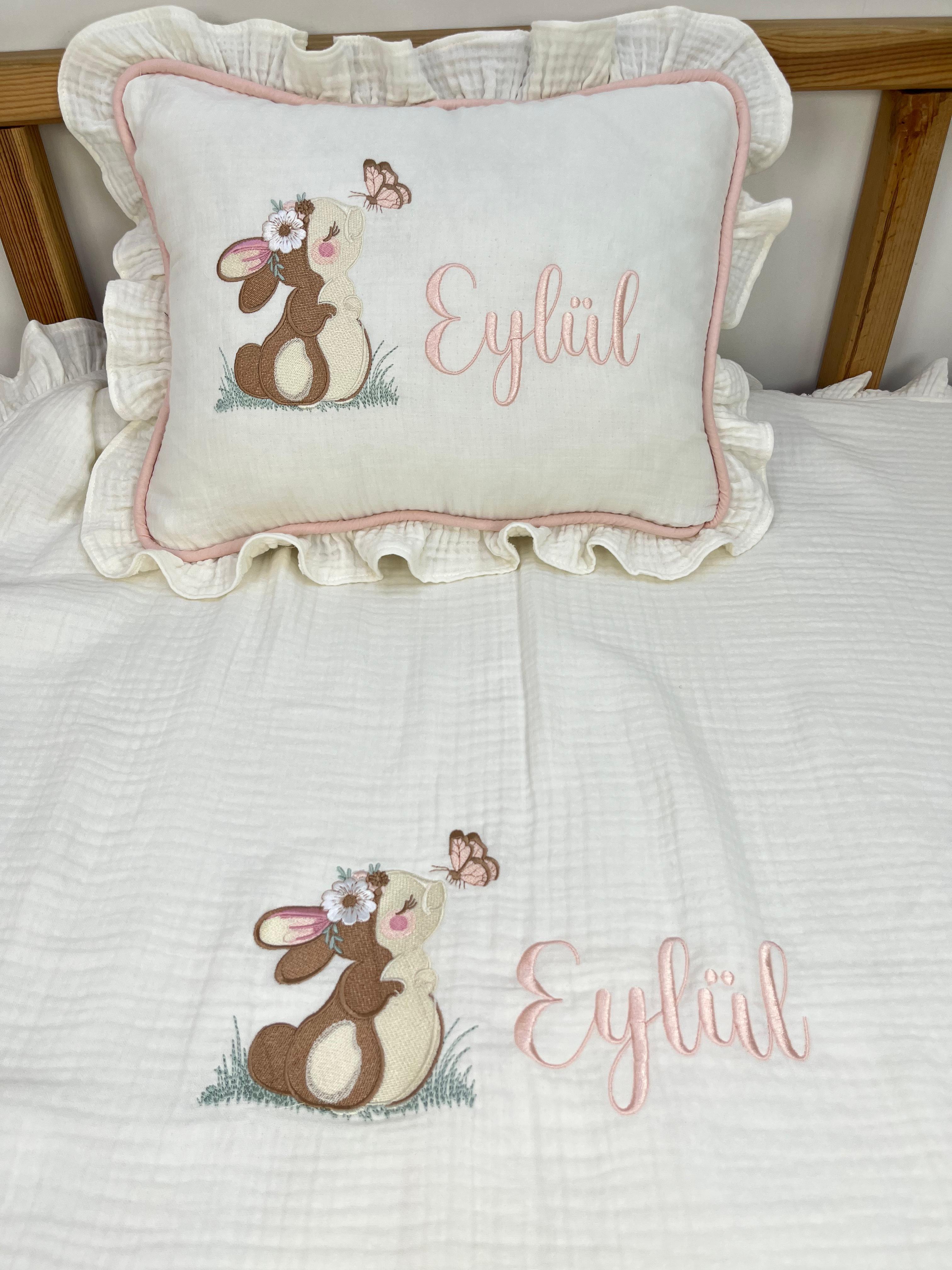 %100 pamuklu 4 kat müslin kumaştan üretilen fırfırlı Battaniye ve Yastık
