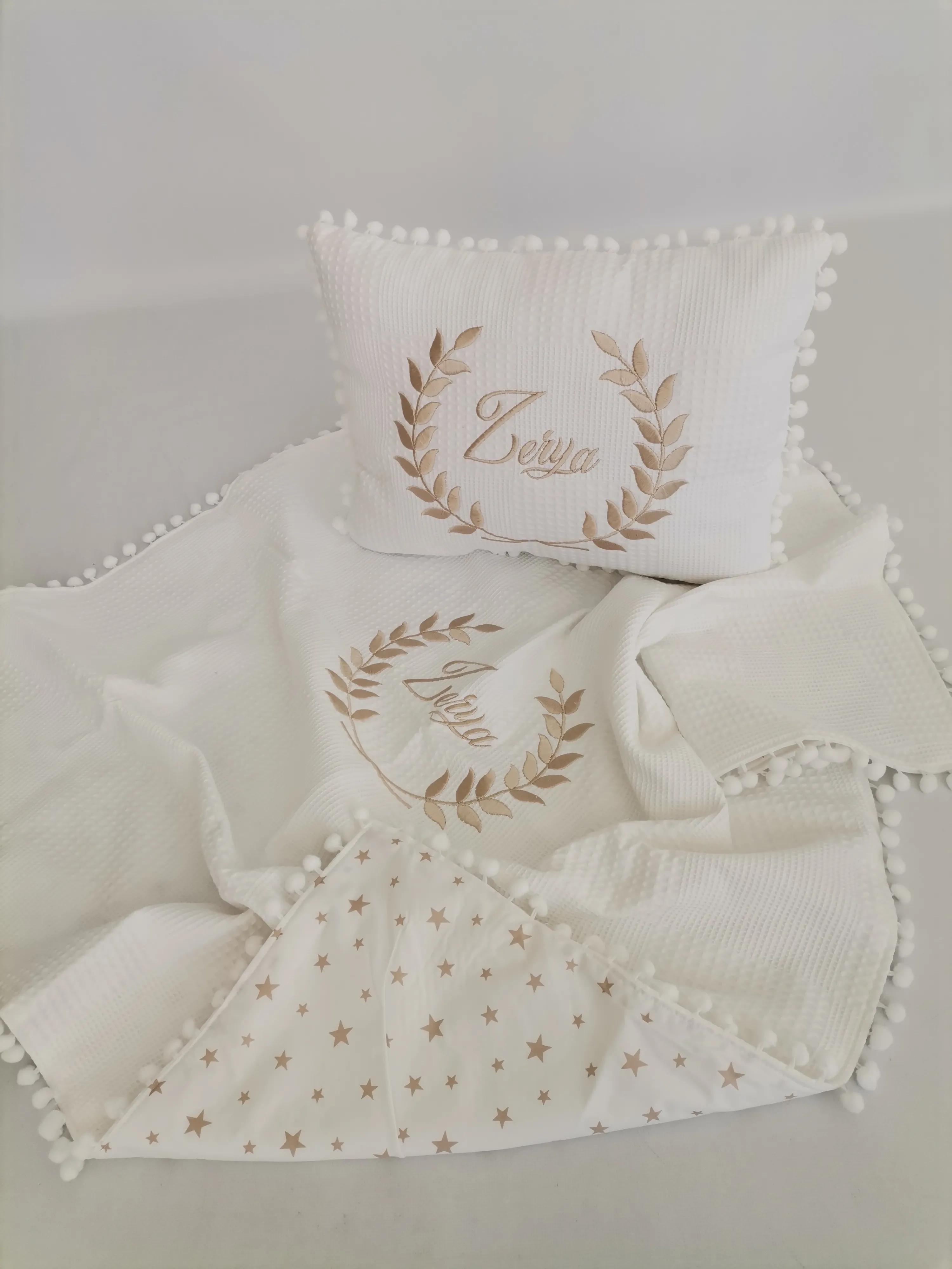 Beyaz klasik wafle Pike ve bej yıldızlı Poplin kumaştan üretilen Ponponlu Battaniye , Nakış ve İsim İşlemeli Yastık
