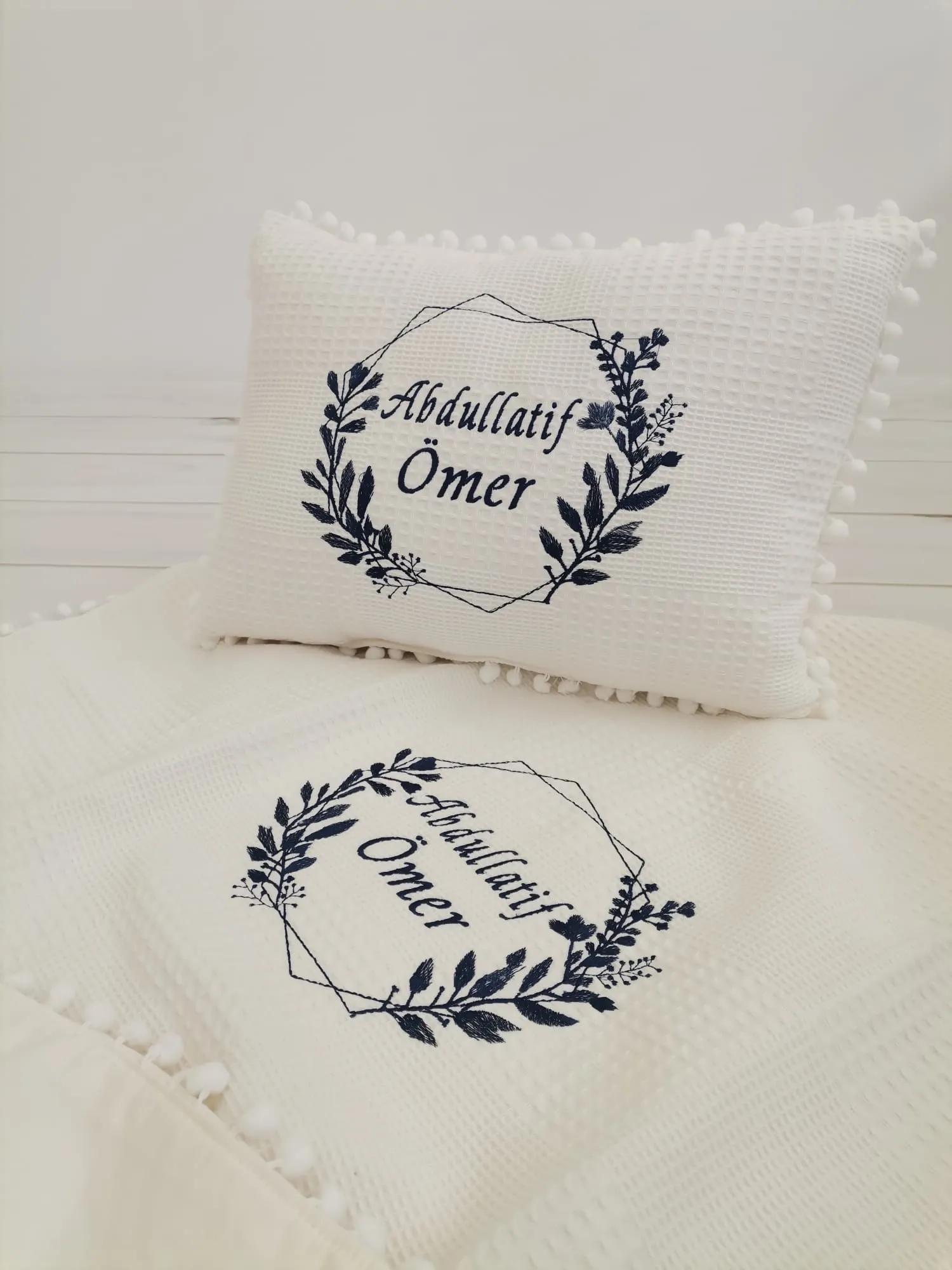 Krem klasik wafle Pike ve krem Poplin kumaştan üretilen Ponponlu Battaniye , Nakış ve İsim İşlemeli Yastık