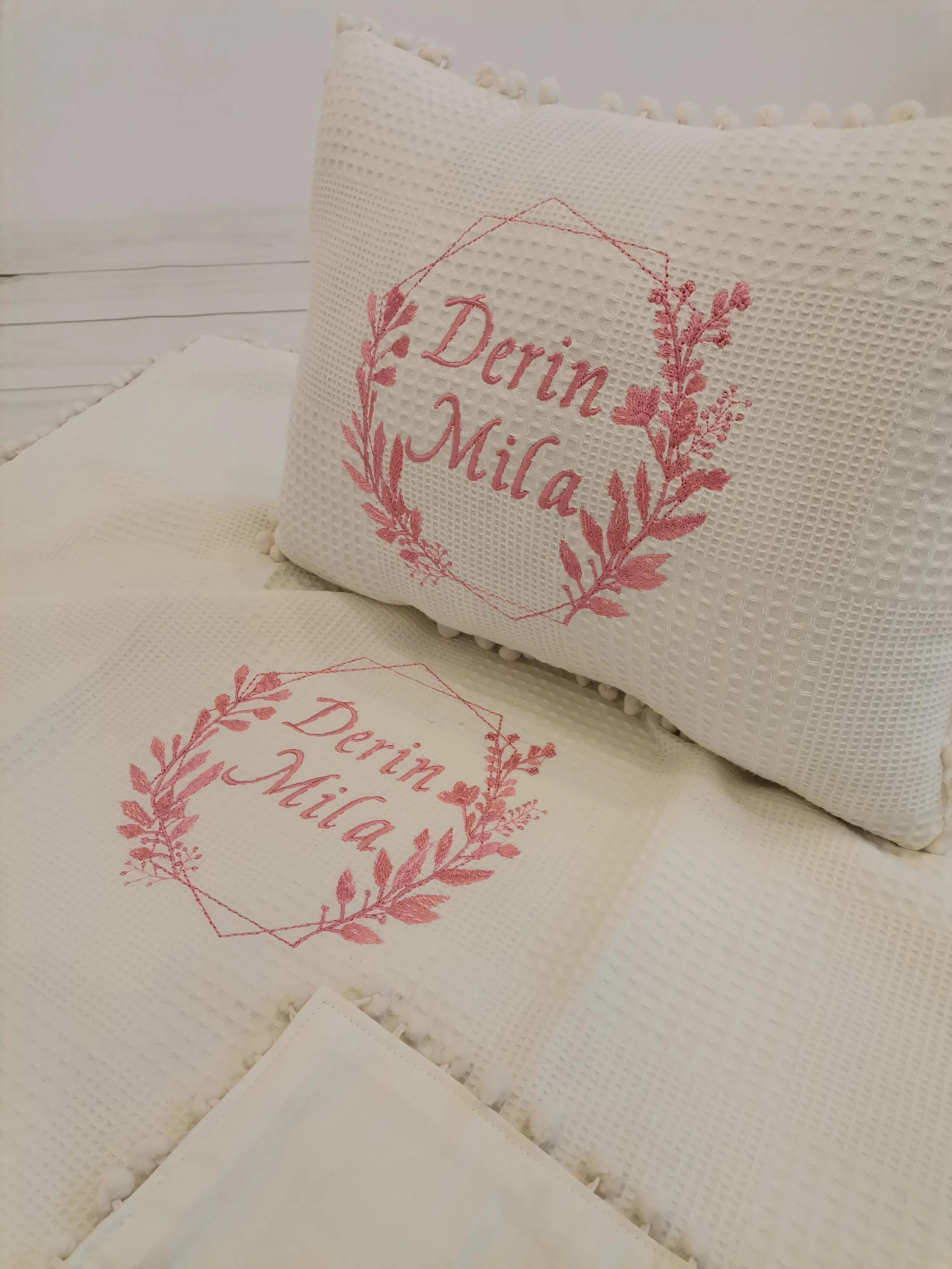 Krem klasik wafle Pike ve krem Poplin kumaştan üretilen Ponponlu Battaniye , Nakış ve İsim İşlemeli Yastık