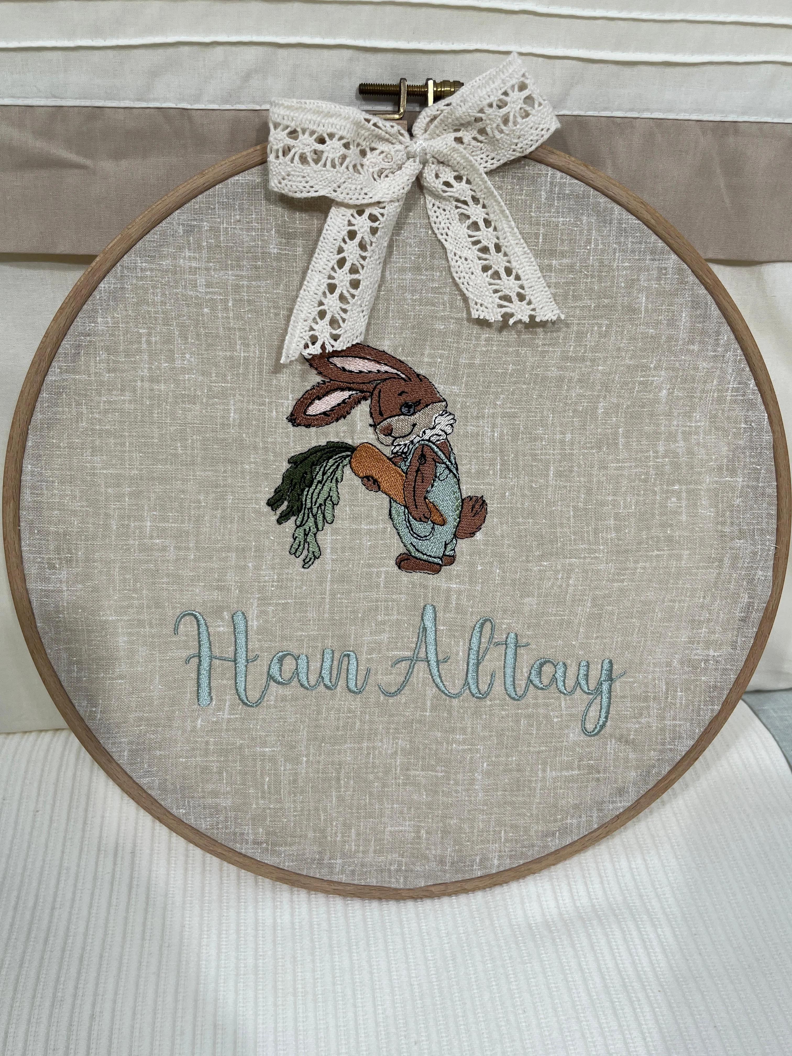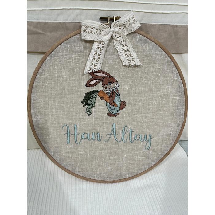 Bej İsviçre keteni kumaştan üretilen kasnak kapı süsü çapı 29 cmdir.