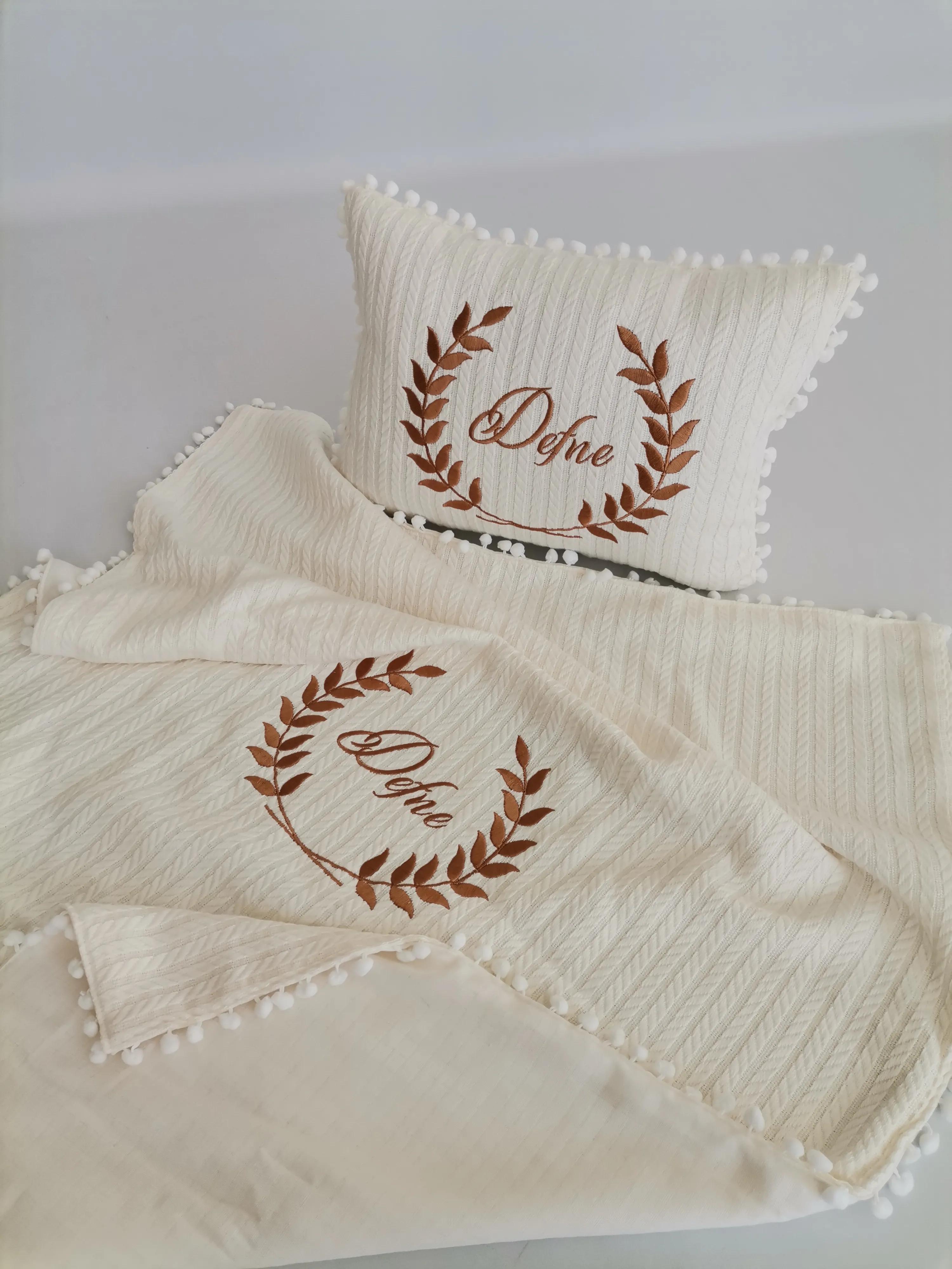 Krem Örgü Pike ve Krem Poplin kumaştan üretilen Ponponlu Battaniye , Nakış ve İsim İşlemeli Yastık