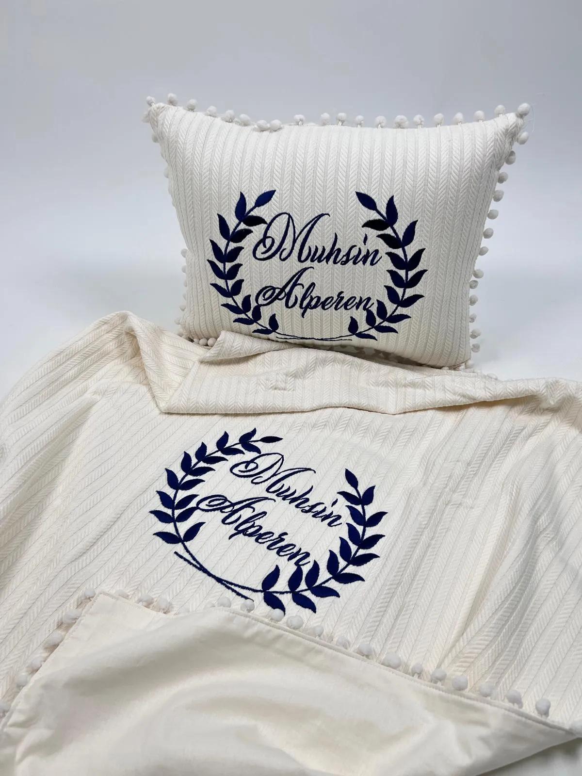 Krem Örgü Pike ve Krem Poplin kumaştan üretilen Ponponlu Battaniye , Nakış ve İsim İşlemeli Yastık