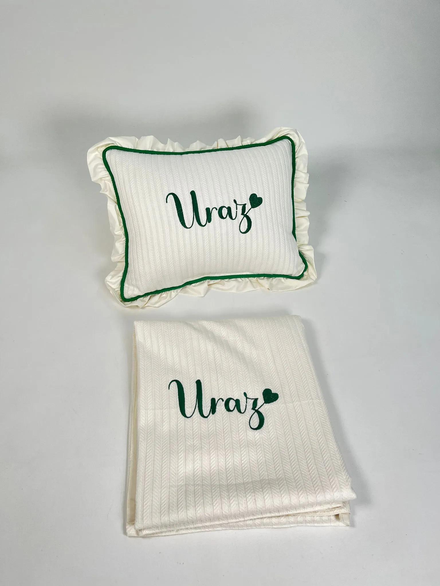 Krem Örgü Pike ve Krem Poplin kumaştan üretilen Ponponlu Battaniye , İsim İşlemeli Yastık