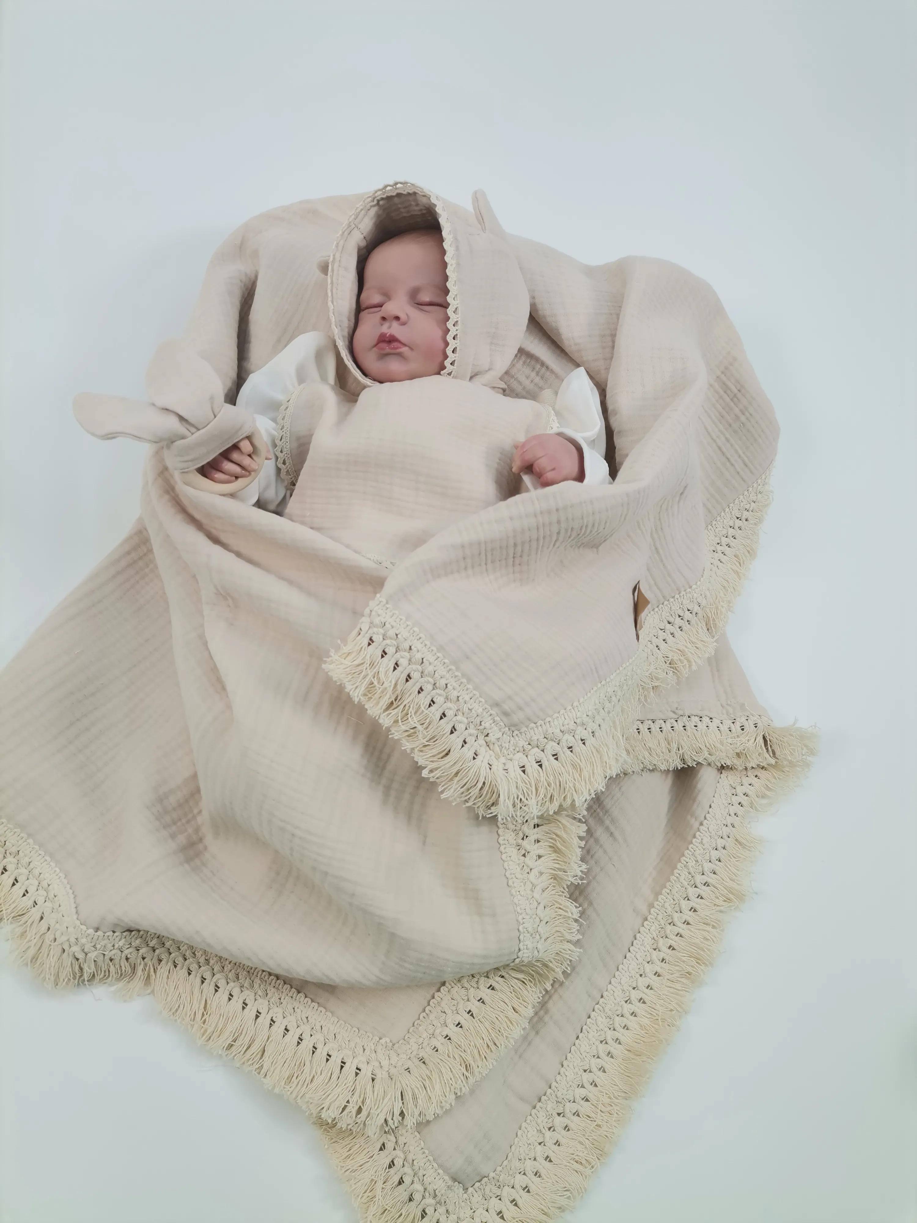 1 adet 4 kat püsküllü müslin battaniye 100x110 cm
