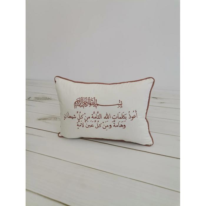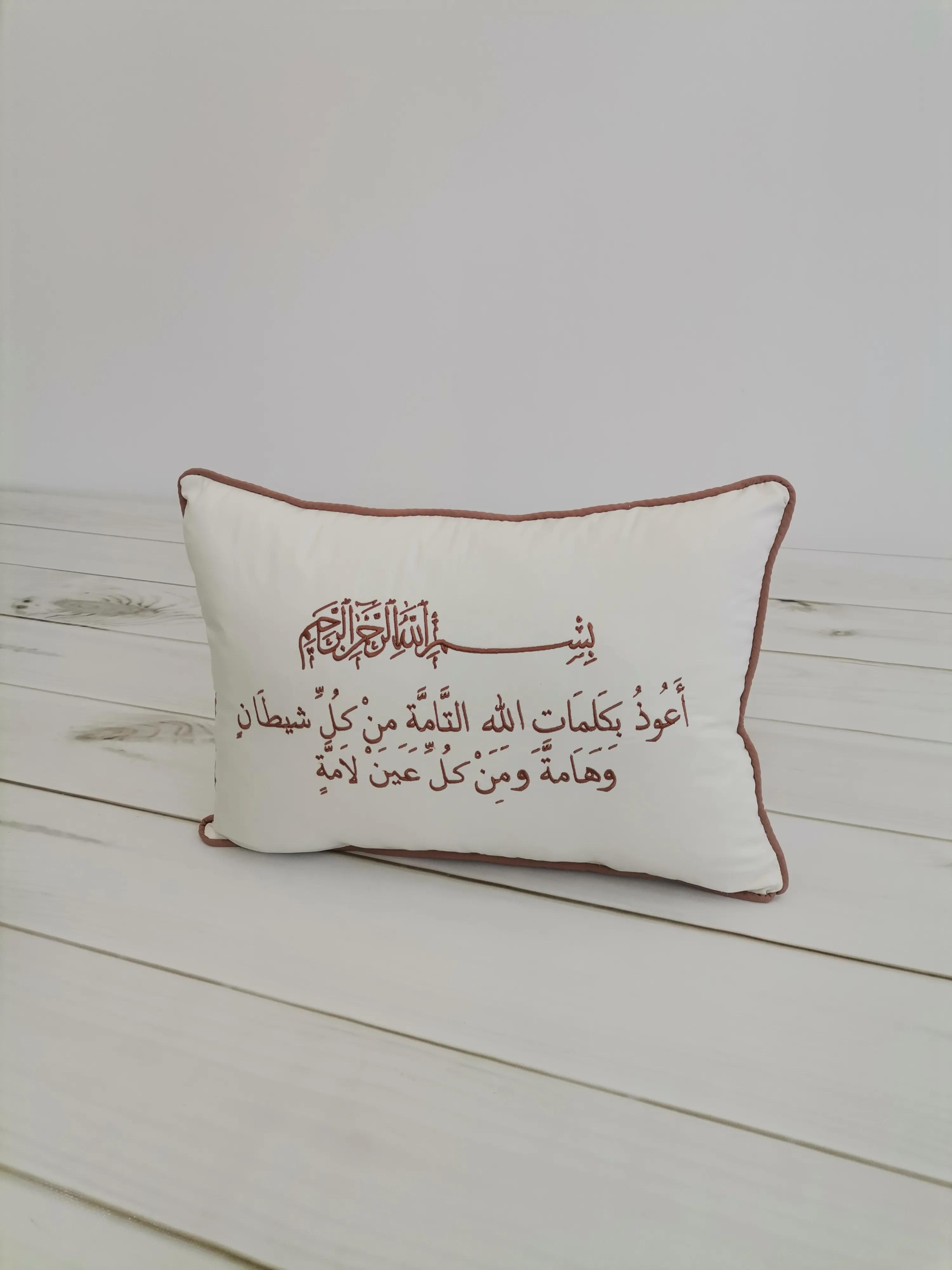 Beyaz poplin - kahve rengi nazar duası işlemeli fitilli Yastık