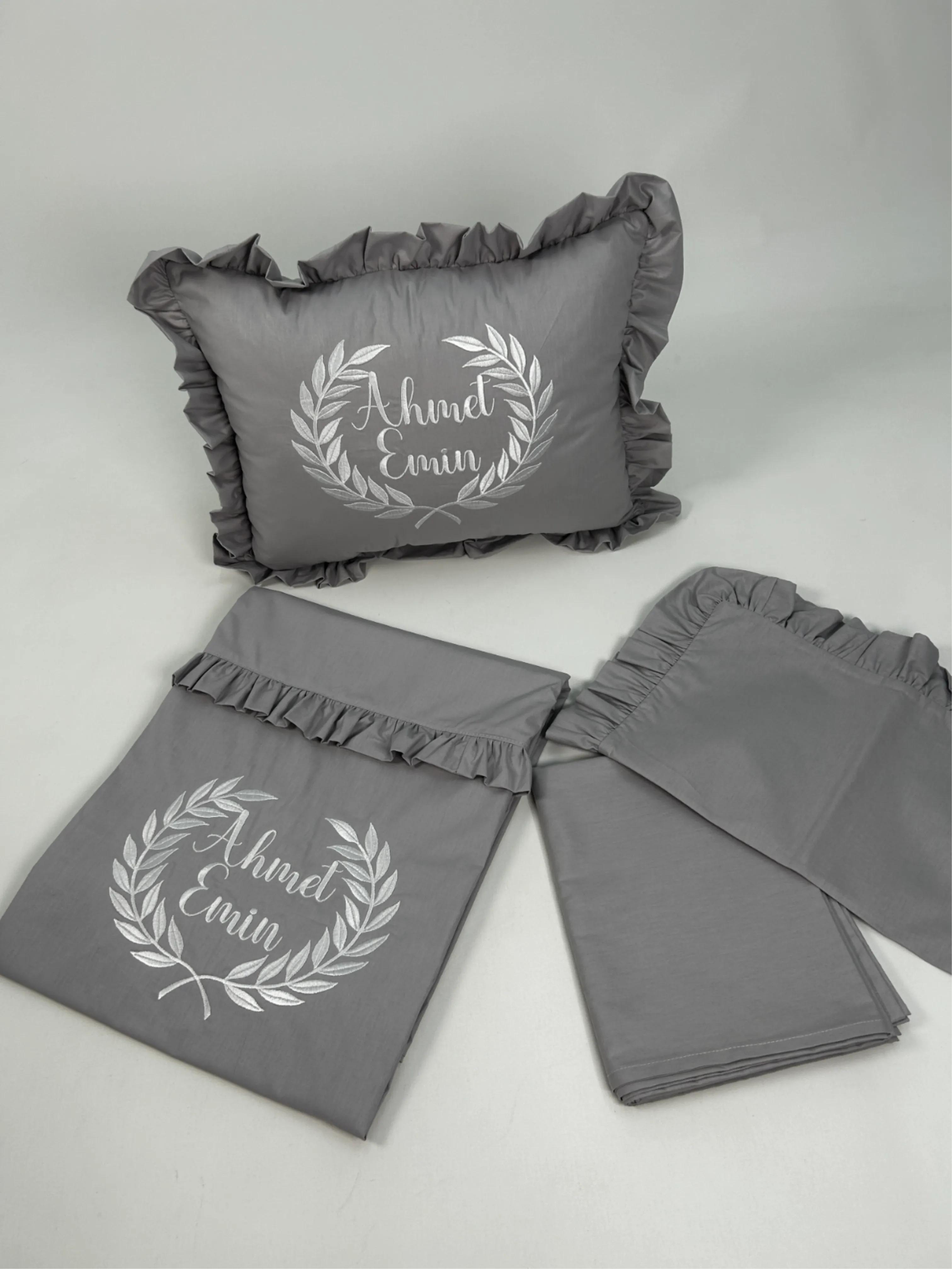 Nevresim takımı 4 parça nakış işlemeli koyu gri poplin
