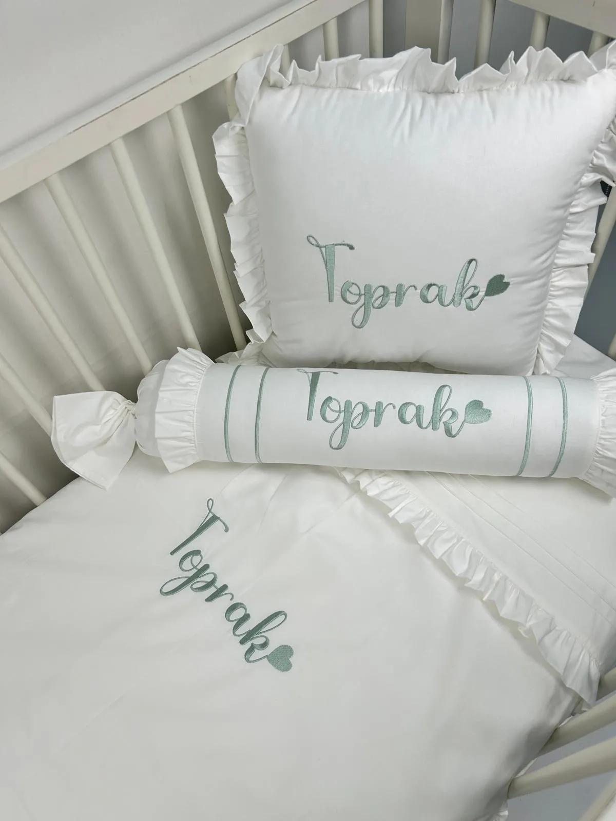 Nevresim takımı 5 parça isim işlemeli beyaz poplin - yeşil
