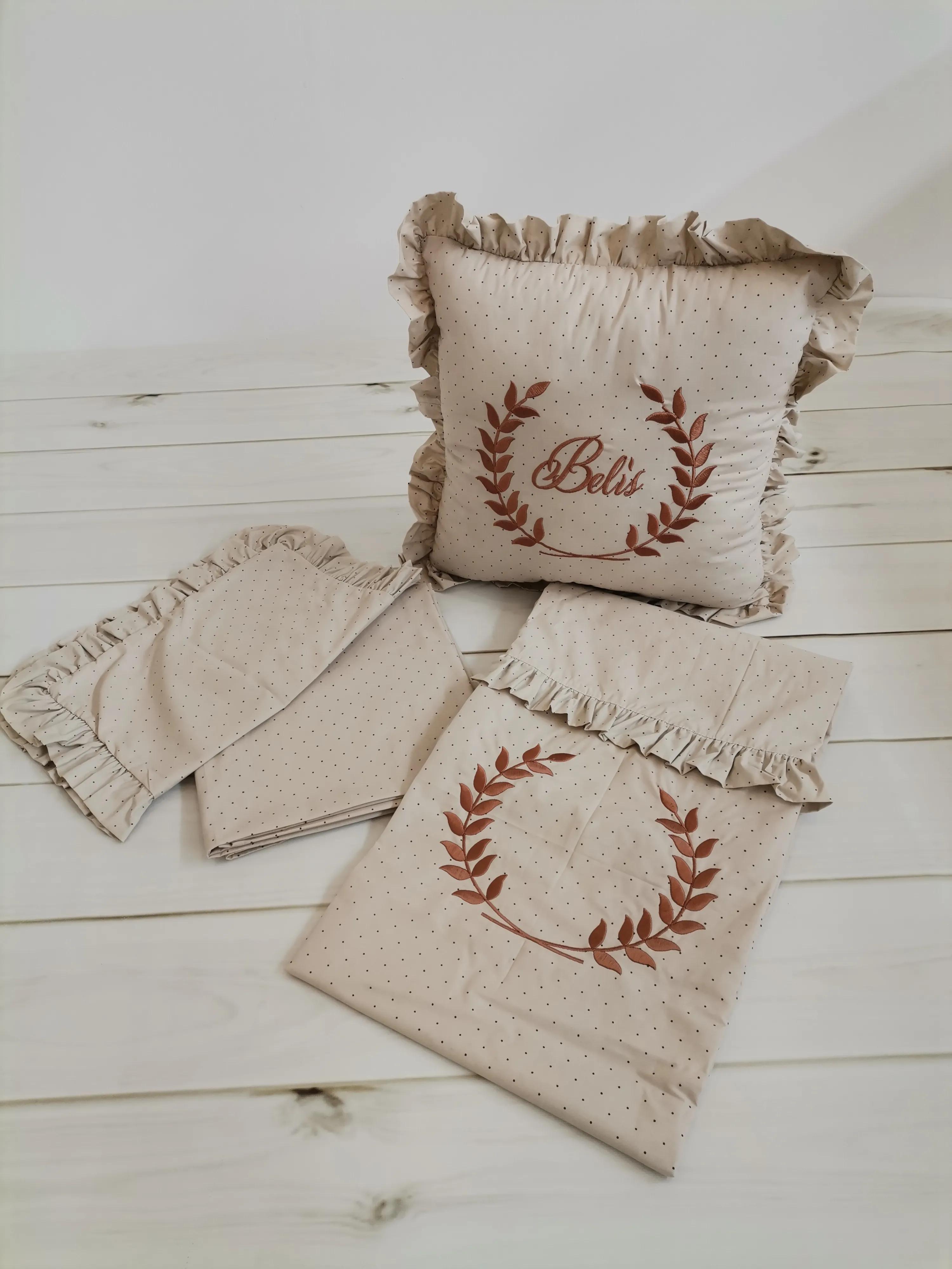 Nevresim takımı nakış işlemeli bej zemin üstü kahve rengi puantiyeli poplin